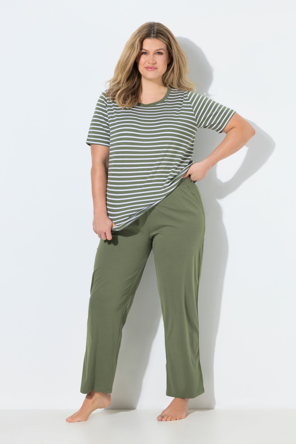 geringeltes Shirt mit Halbarm, Rundhalsausschnitt, lange, gerade Hose mit Elastikbund, seitliche Taschen, nachhaltige Biobaumwolle, Größenangepasste Länge ca. 72-76 cm.