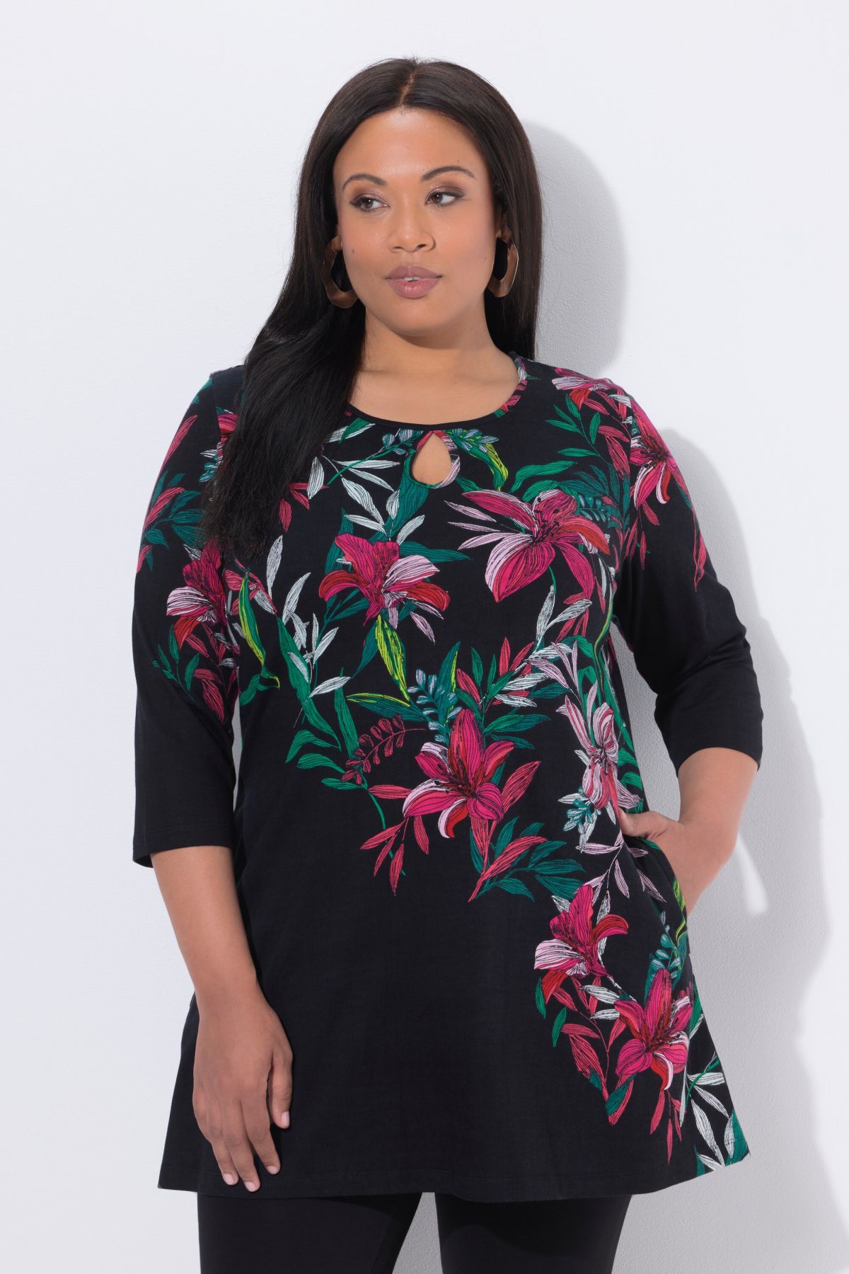 Longshirt, A-Linie, mit dekorativem Motiv. Kleine Aussparung am Rundhalsausschnitt, 3/4-Ärmel. Bequem weiter Saum.