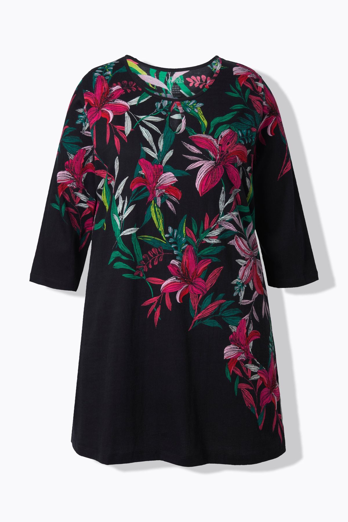 dekorativer Druck, Rundhalsausschnitt mit kleiner Aussparung, längere A-Linie mit bequem weitem Saum, 3/4-Ärmel, reine Baumwolle, Länge ca. 86 cm.