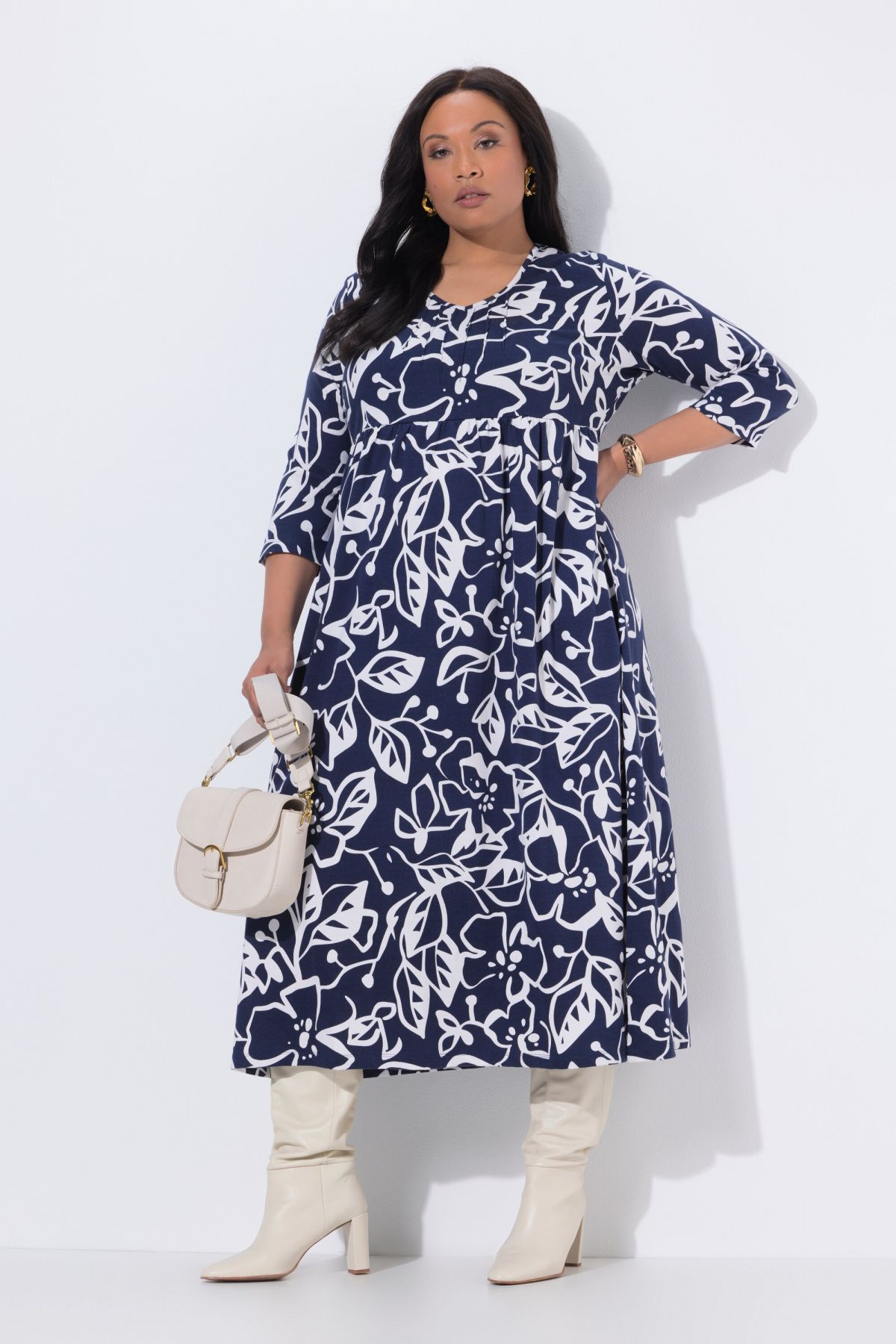 Jersey-Maxikleid, A-Linie, mit Blumenmuster. Bequeme Passform mit Zierfalten vorne am V-Ausschnitt und elastischer Empirenaht. 3/4-Ärmel, seitliche Nahttaschen.