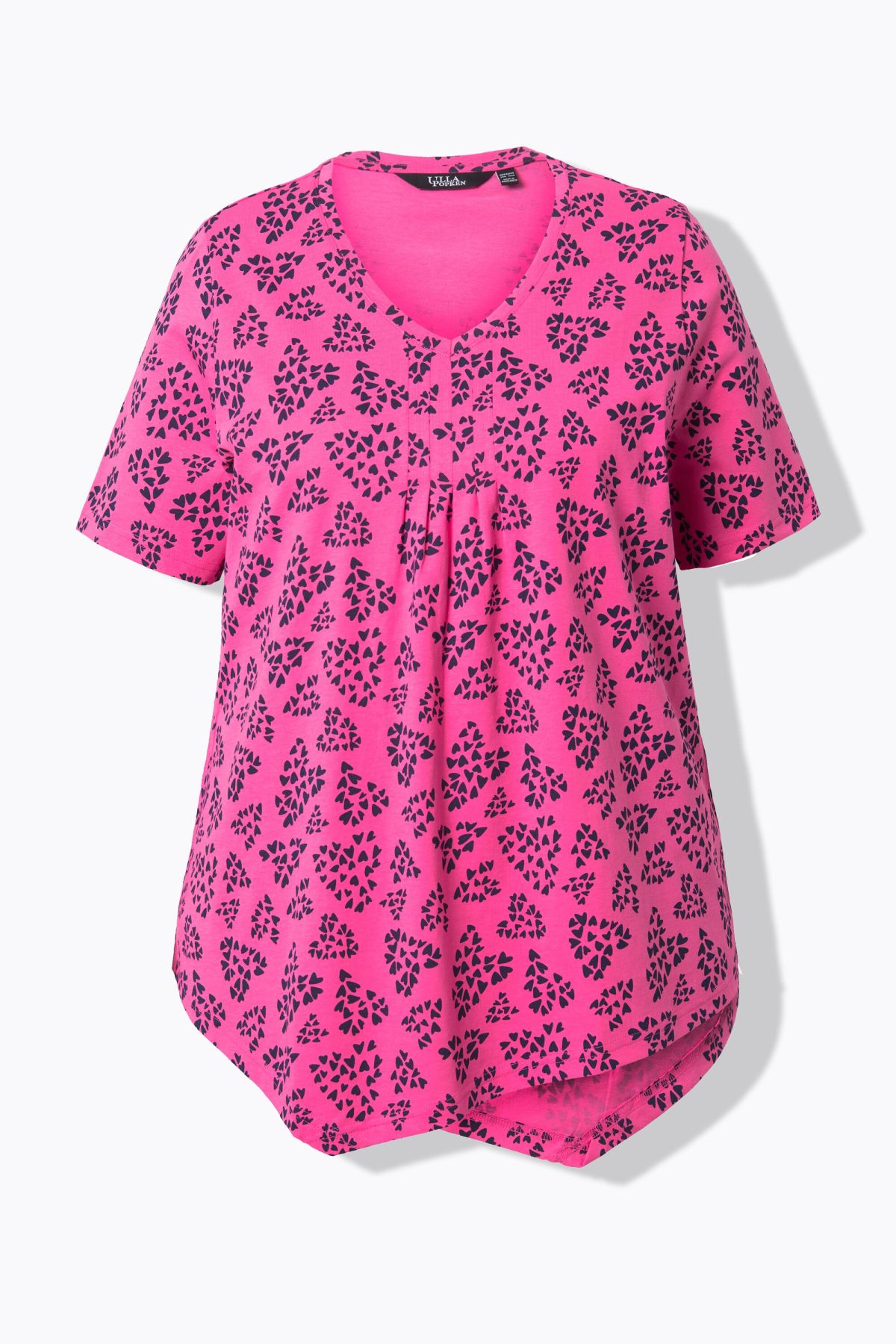 modisches Herzmuster, leicht gerundeter V-Ausschnitt, A-Linie mit Zipfelsaum in bequemer Weite, Halbarm, reine Baumwolle, Größenangepasste Länge ca. 72-76 cm.