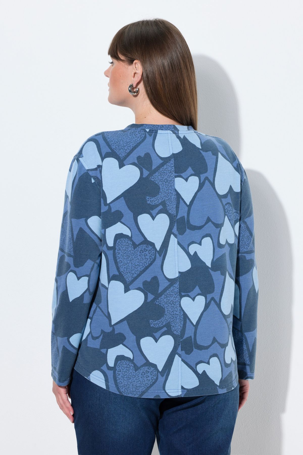 modisch vorgewaschener Sweat mit Herzmuster, V-Ausschnitt, bequeme A-Linie, leicht oversized, Langarm, gerundeter Saum, moderne, glatte Abschlüsse, Größenangepasste Länge ca. 68-76 cm.