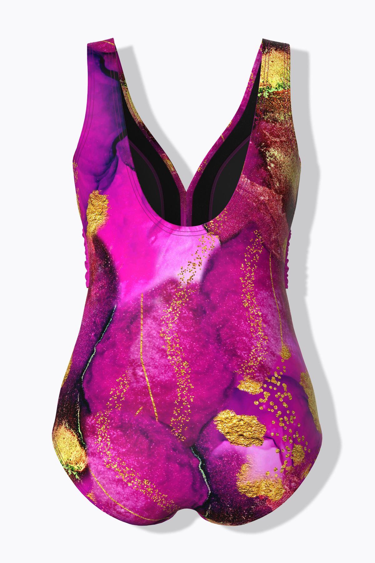 Badeanzug mit Softschalen und leuchtendem Farbmuster. V-Ausschnitt, unter der Büste Zierband mit kleiner Schmuckschnalle. Stützendes Unterbrustband, Vorderfutter. OEKO-TEX.