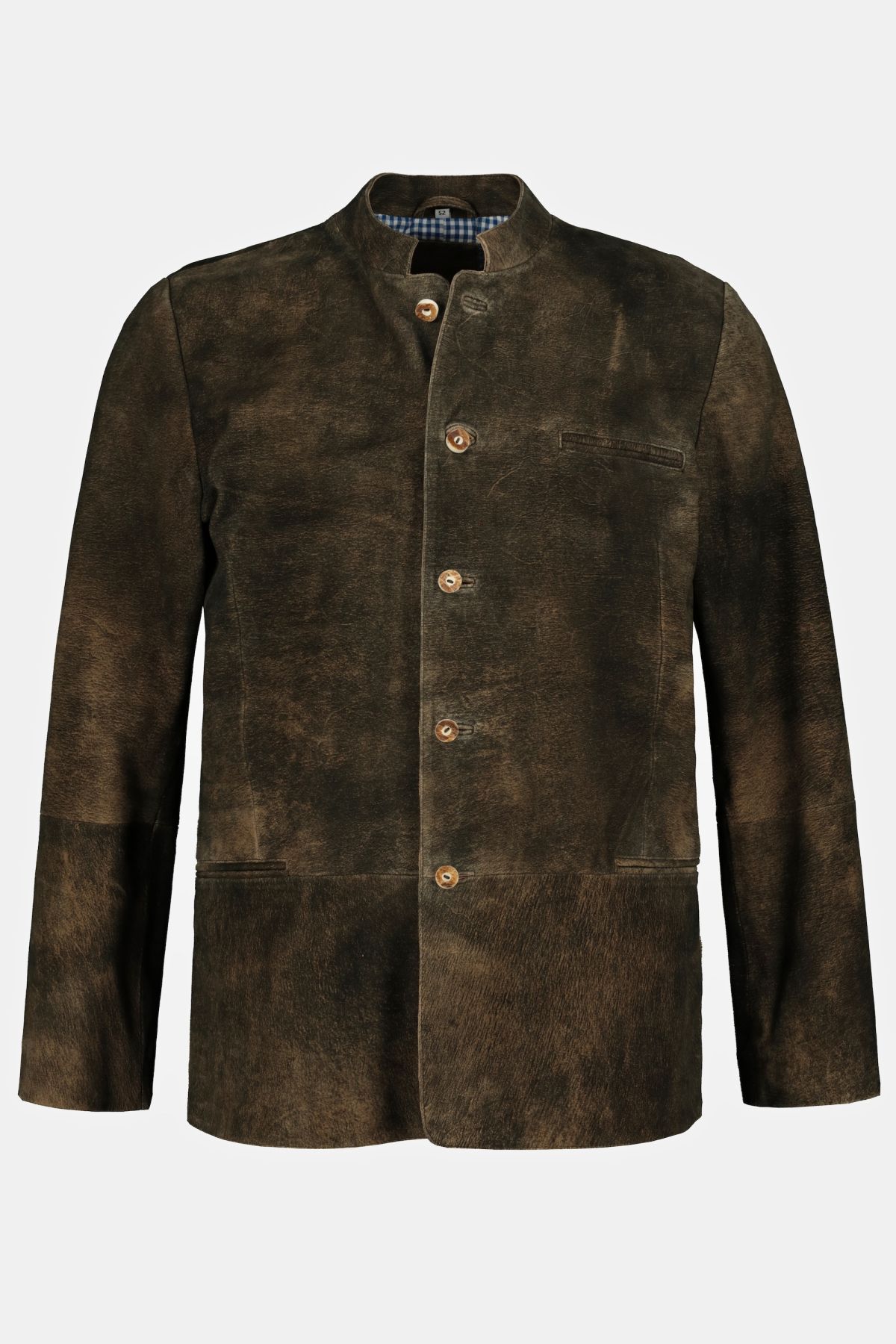 Jaquette style bavarois en cuir velours de chèvre des plus fins avec col droit, boutons effet corne et 3 poches. Doublure de haute qualité à carreaux vichy et 2 poches. Cette coupe testée vous convaincra aussi dans les grandes tailles. JP1880 - for real men only!& 10;<br>