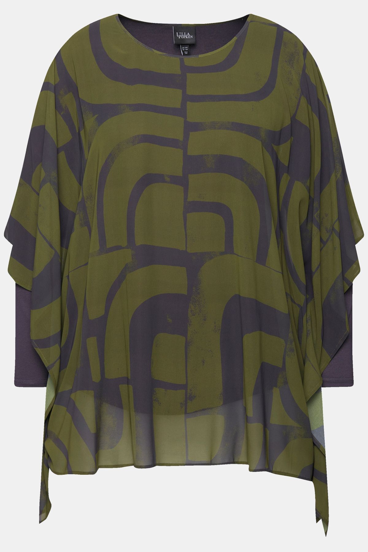 Mousseline dans un imprimé graphique sur le dessus, Décolleté rond, Coupe oversize décontractée et tendance, se terminant en pointe de chaque côté, Top en jersey opaque en dessous, Manches longues, Long. selon taille env. 72-76 cm.