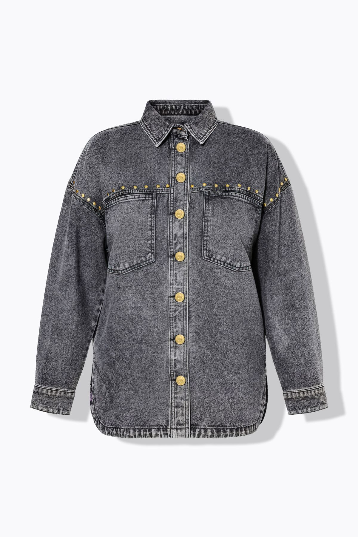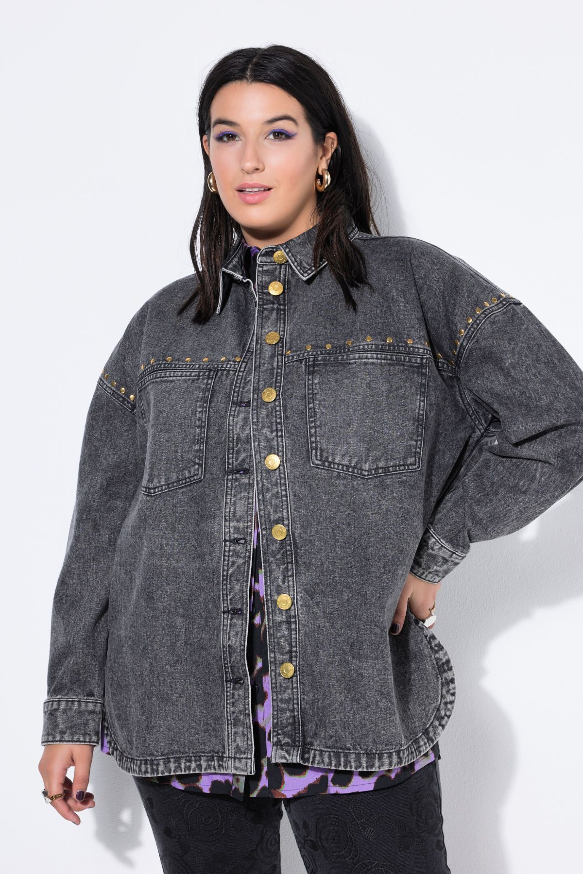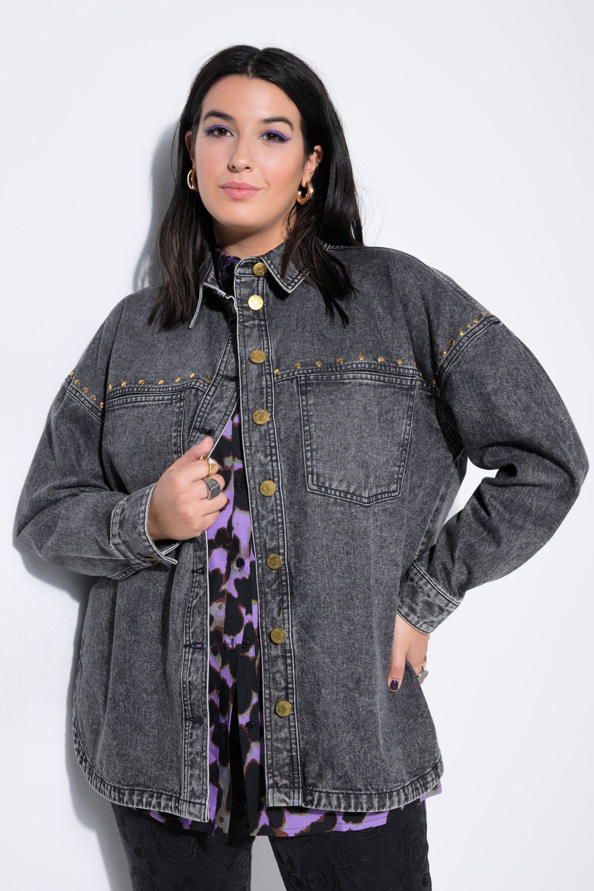 Coupe oversize, Tissu denim doux et confortable, esprit vintage, Rivets fantaisie brillants, 2 poches poitrine, Base arrondie avec fente sur les côtés, Long. selon taille env. 76-80 cm.