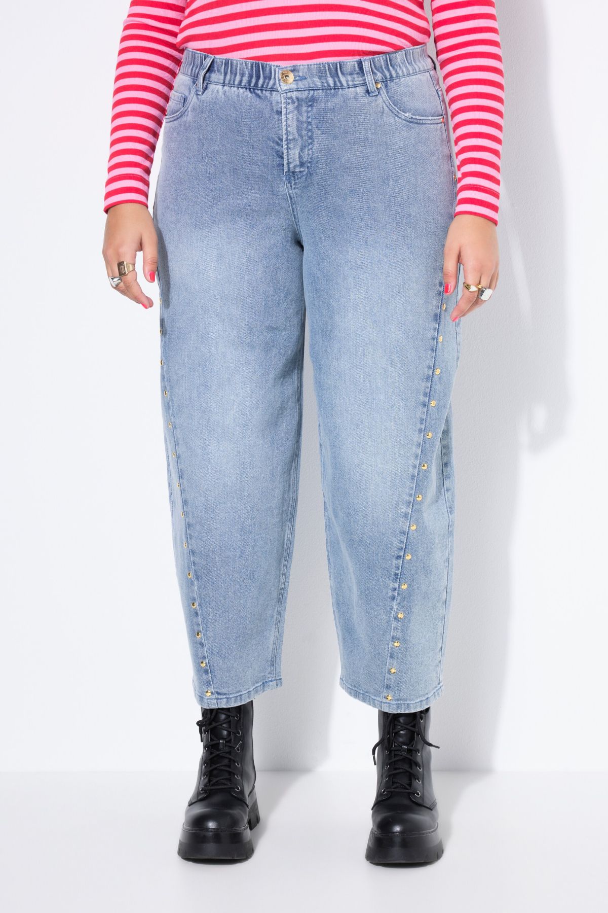 Jean Barrel avec rivets fantaisie, jambe ballon et taille haute