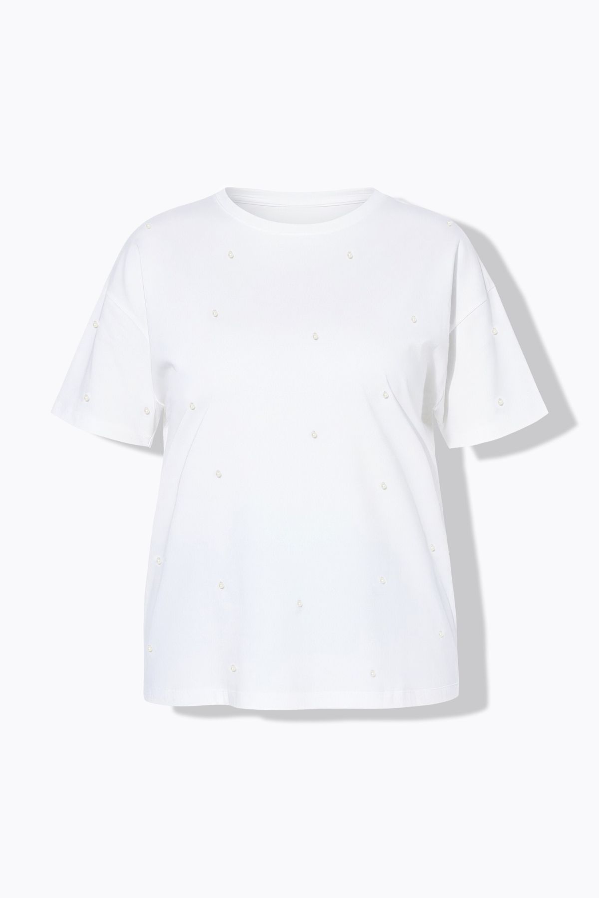 Épaules légèrement basses, Jersey doux et confortable, Perles fantaisie sur le devant, Manches courtes, Long. selon taille env. 65-73 cm.