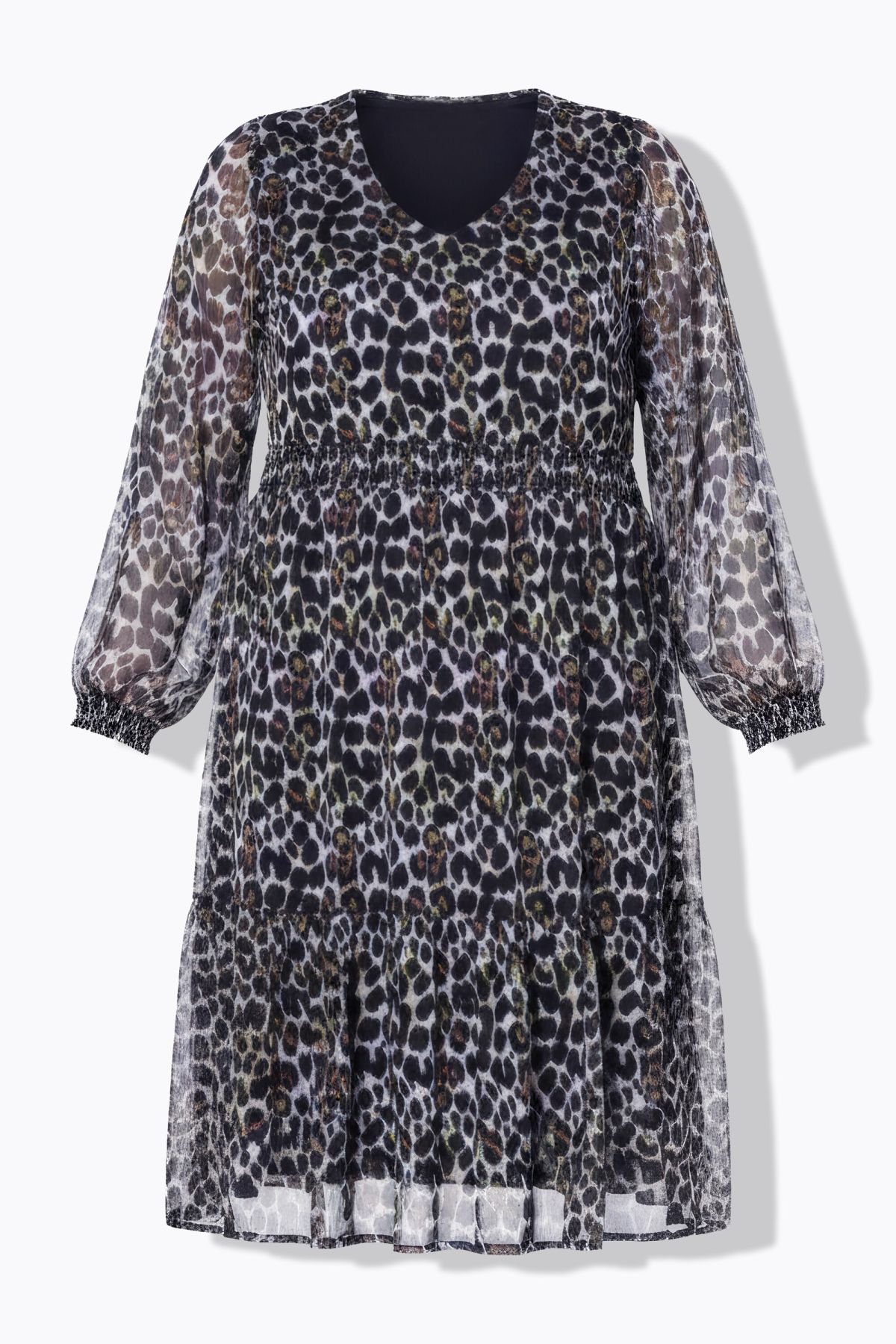 Robe midi doublée, motif léopard et volant à la base, coupe évasée