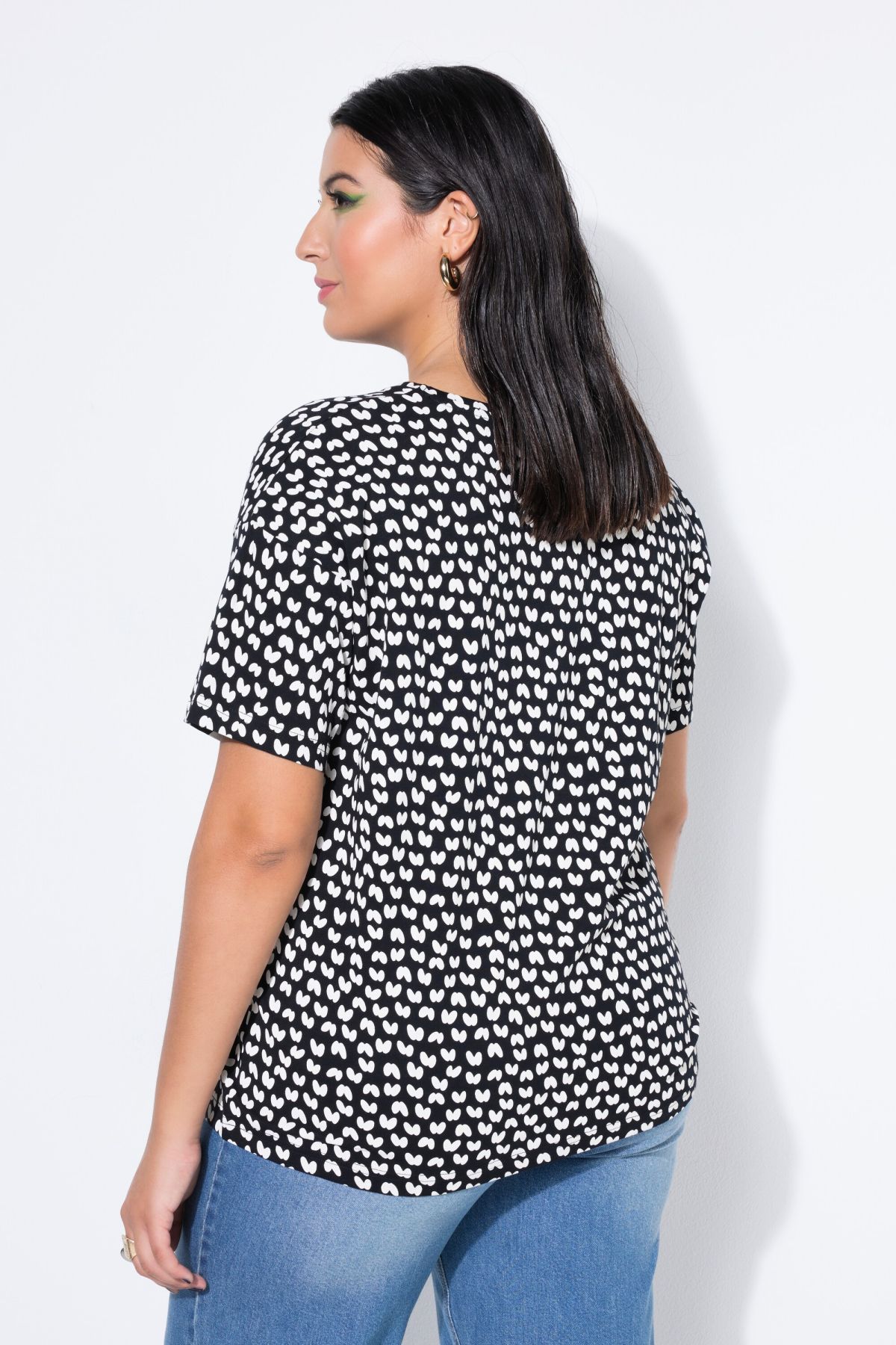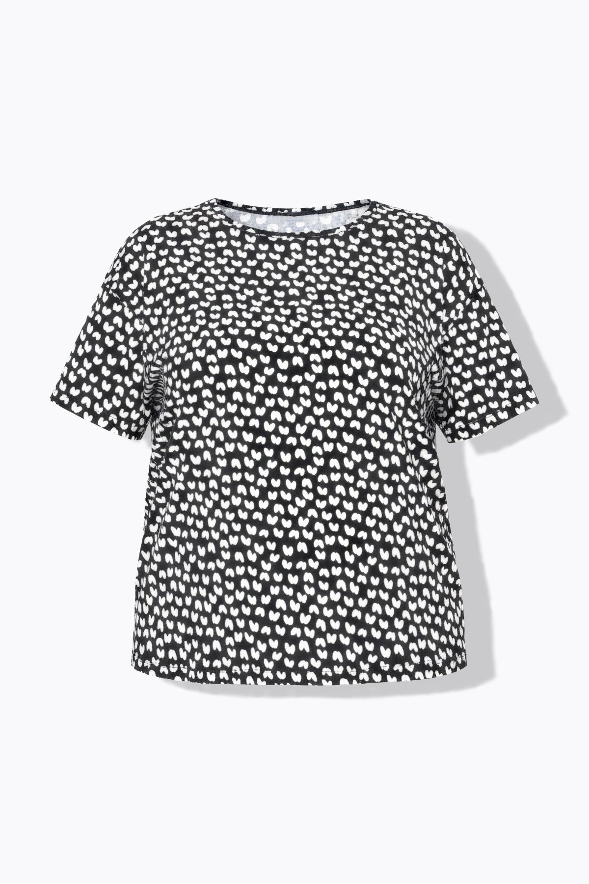 Épaules légèrement basses, Jersey doux et confortable, Imprimé noir & blanc, Manches courtes, Long. selon taille env. 65-73 cm.
