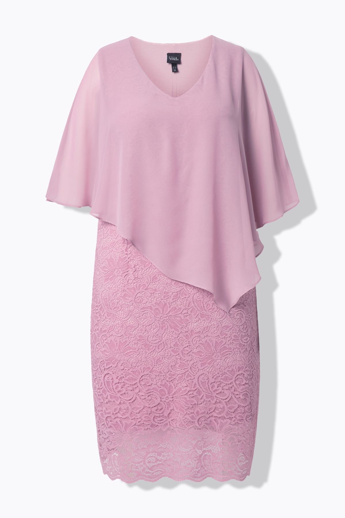 Robe de soirée en jersey. Cape en mousseline. Bas de jupe en dentelle. Manches 3/4