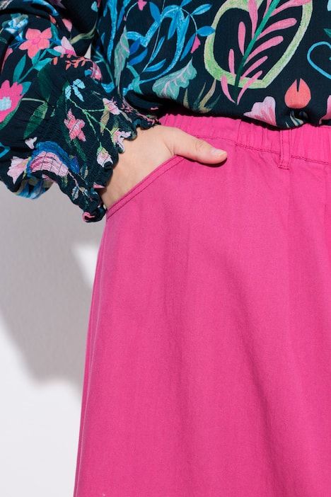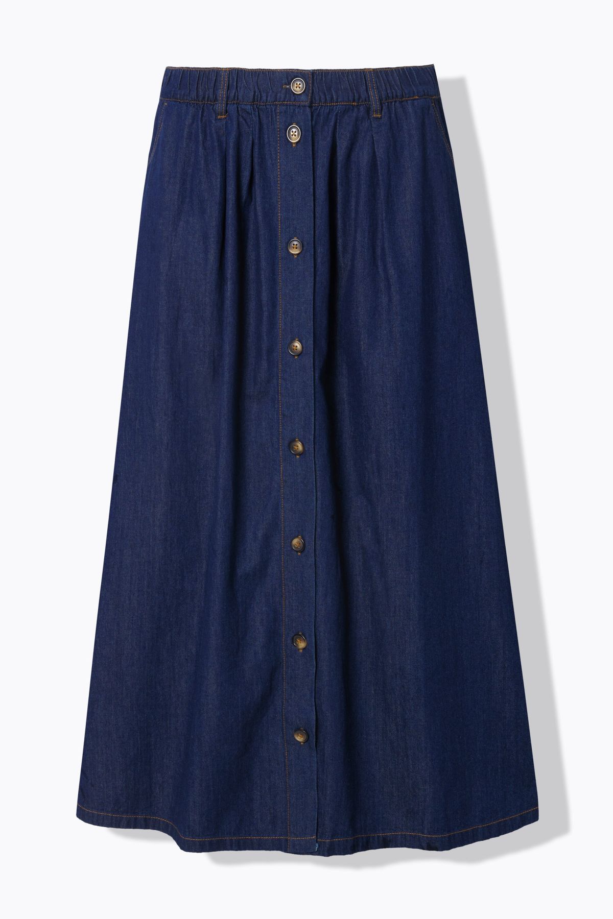 Jupe en jean, coupe évasée. Taille élastique. Boutons fantaisie