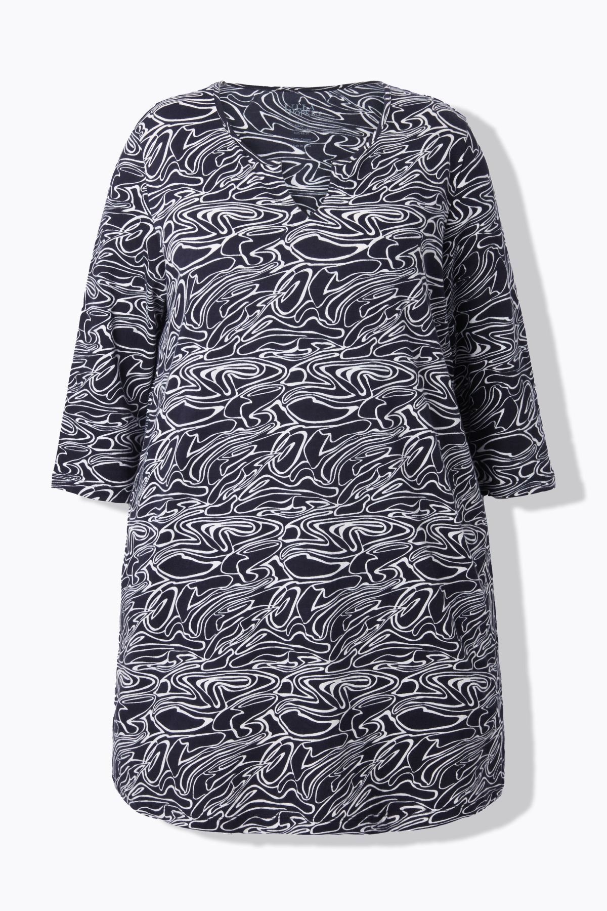 T-shirt long, A-Line, mit Wellen Print. Tunika-Ausschnitt, 3/4-Ärmel. Bequem weiter Saum.
