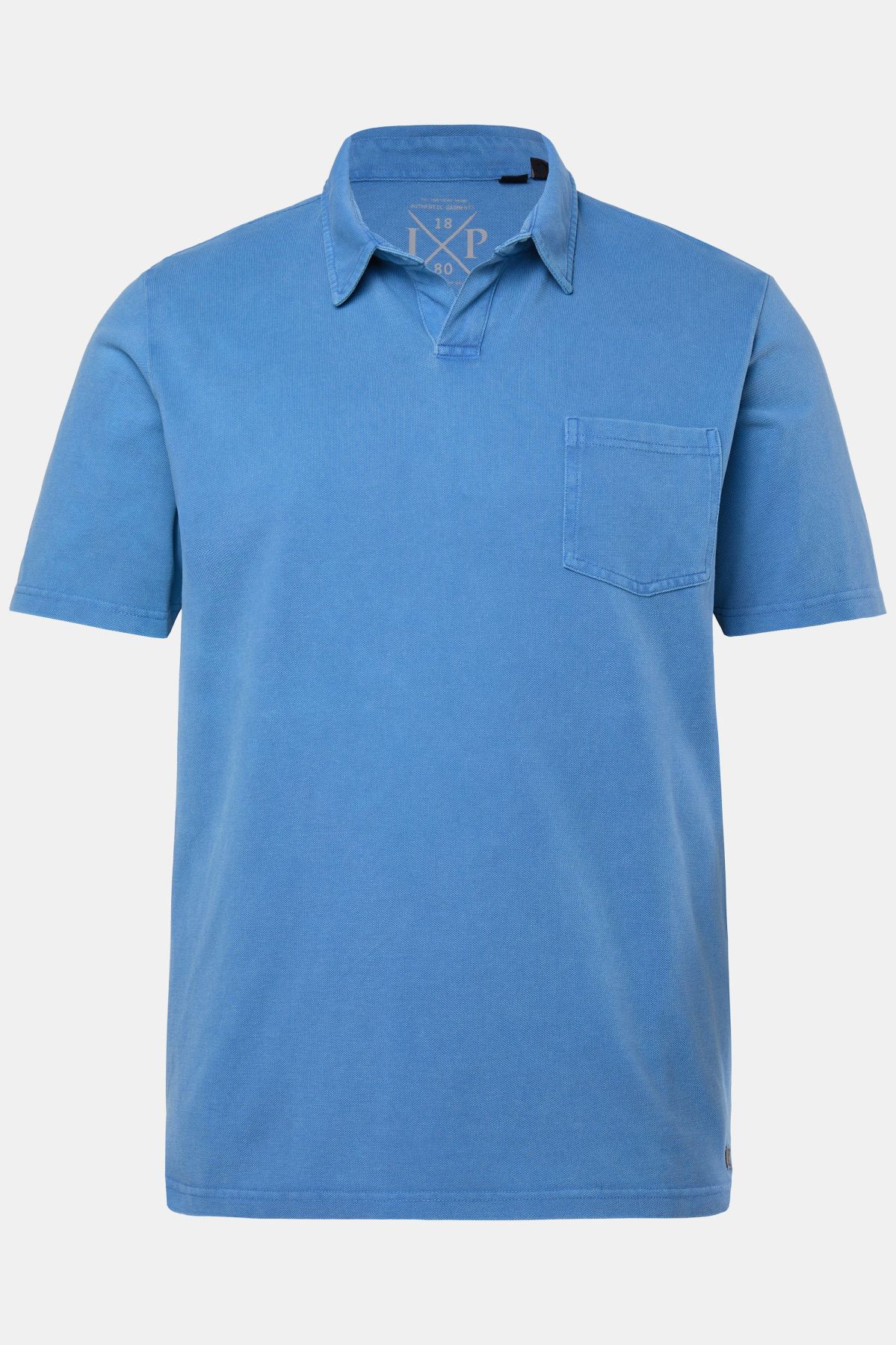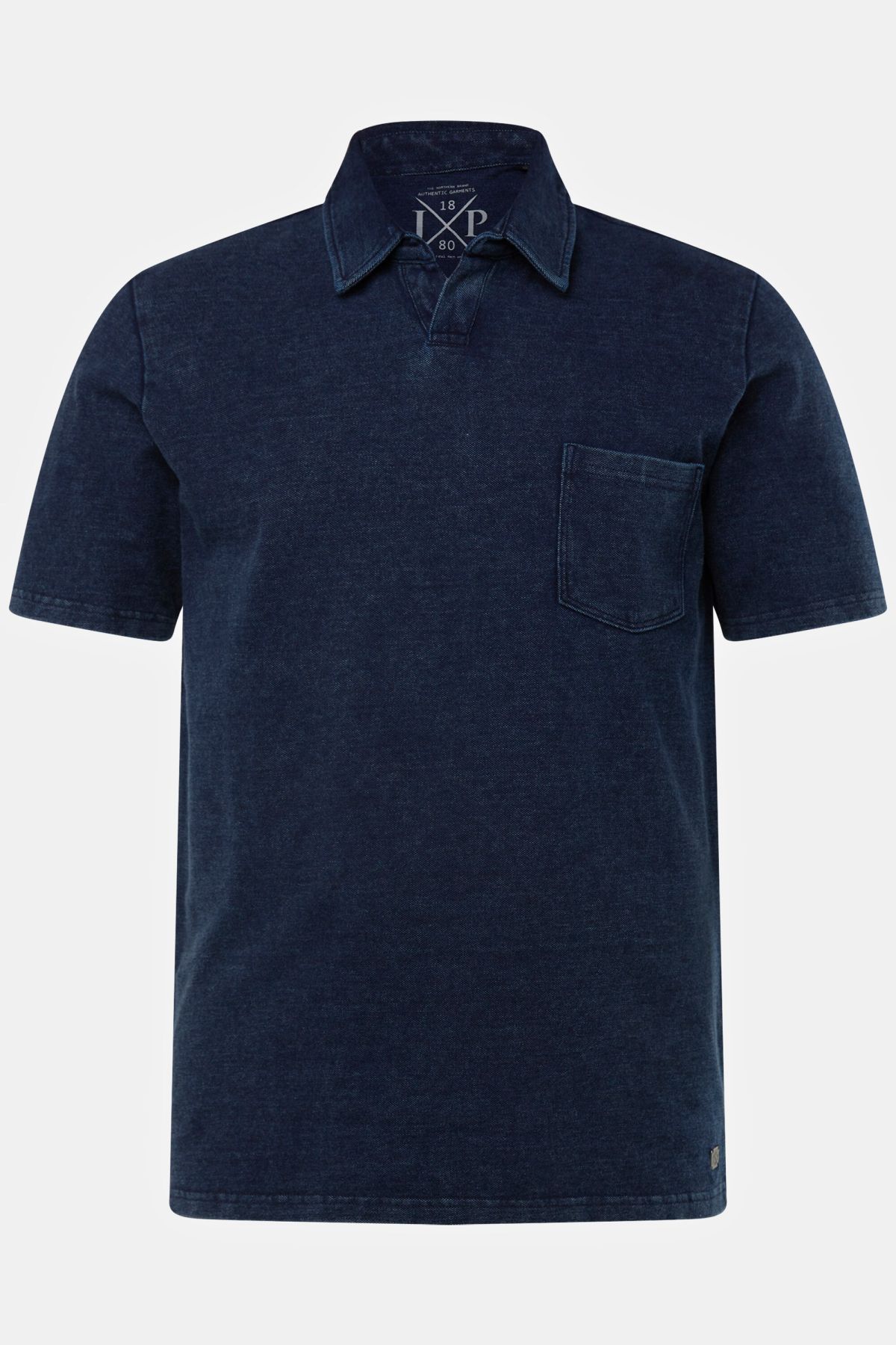 Coupe spéciale jusqu'au 8 XL, Maille piquée aspect denim - teinture indigo, Col polo avec encolure en V, Poche poitrine, Manches courtes, Long. entrej. env. 74-86