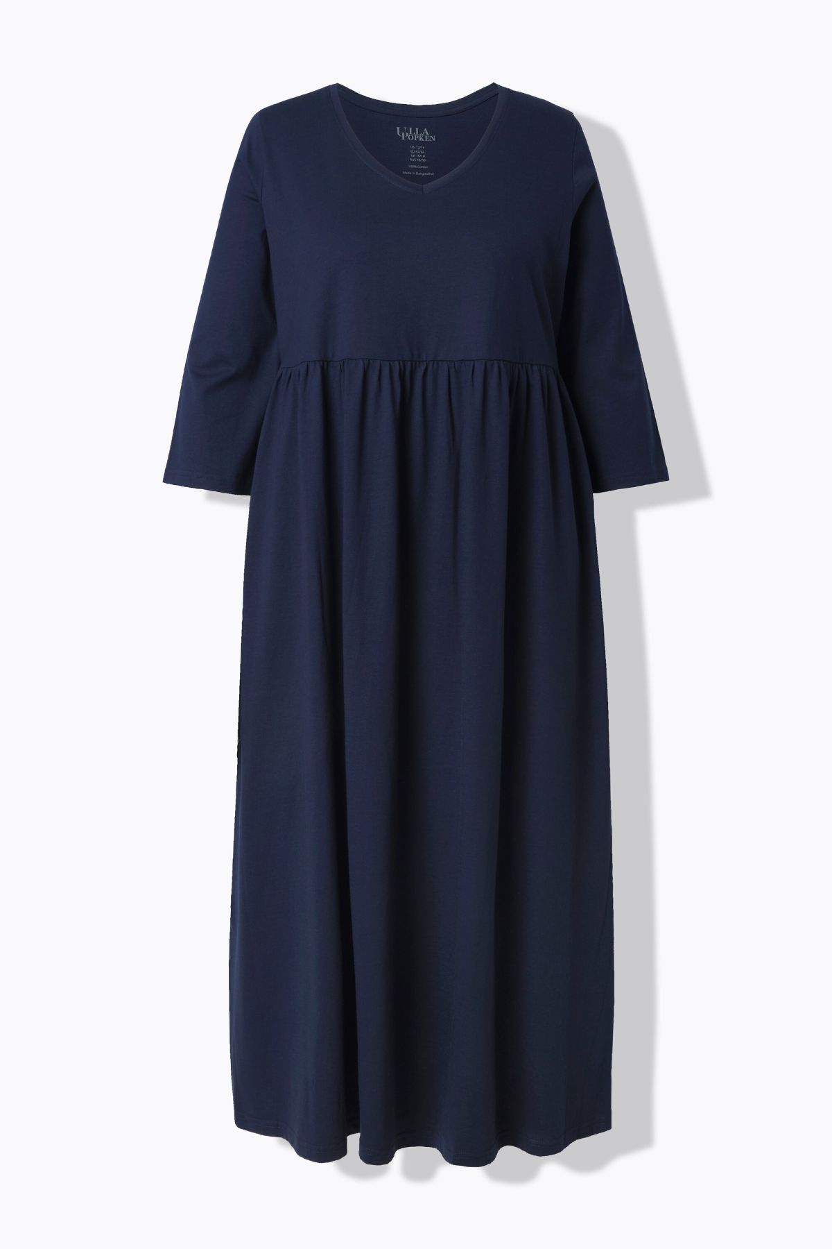 Coupe féminine avec couture empire élastique, Décolleté en V, Coupe évasée et confortable, Poches latérales réservées dans la couture, Pur coton, Long. env. 127 cm.