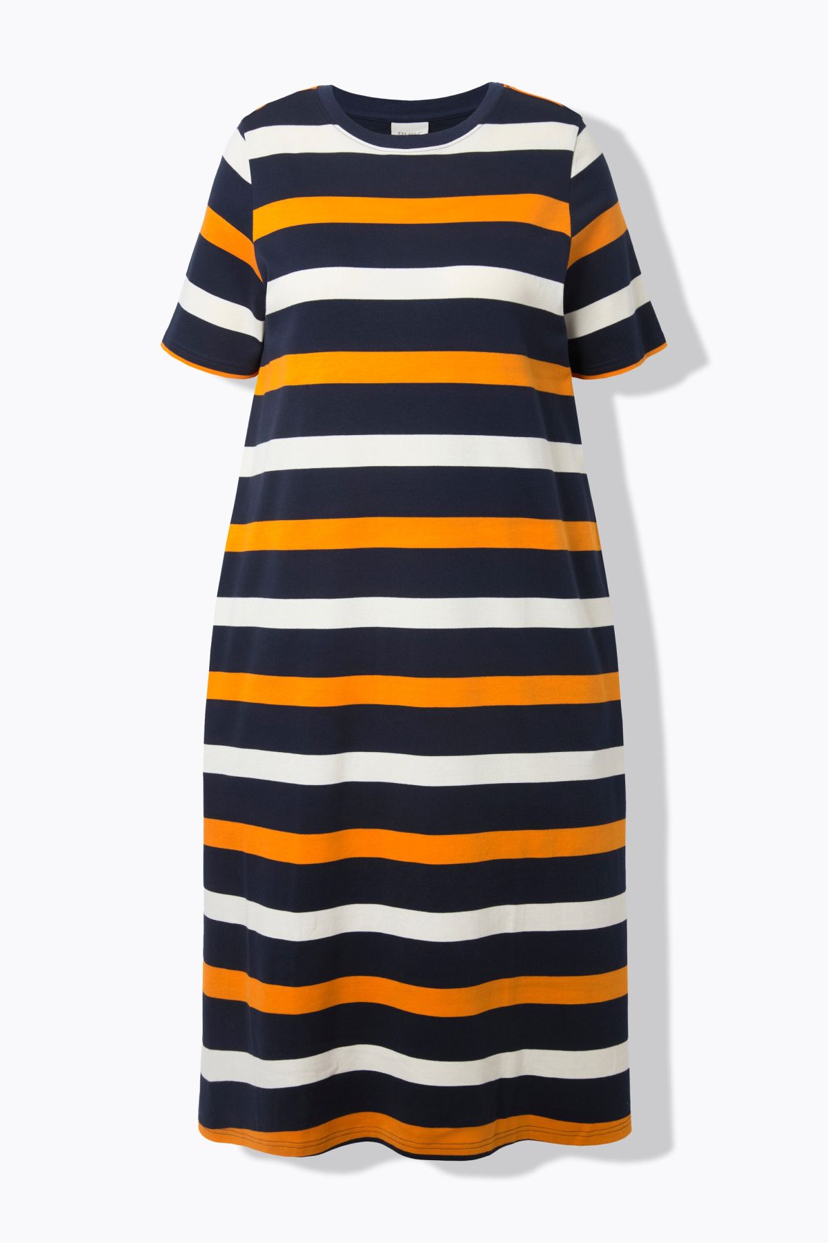 Jersey Interlock de très grande qualité, motif à rayures, Col rond, Coupe évasée confortable, avec fentes sur les côtés, Manches courtes, Coton bio durable, Long. env. 120 cm.