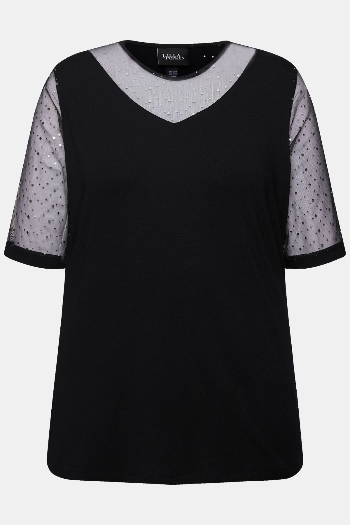 Coupe Classic Fit confortable, Voile en mesh à sequins sur top en jersey opaque, Col rond et encolure en V, Manches courtes transparentes, Matière douce et confortable, au tombé fluide, Long entrej env. 68-76