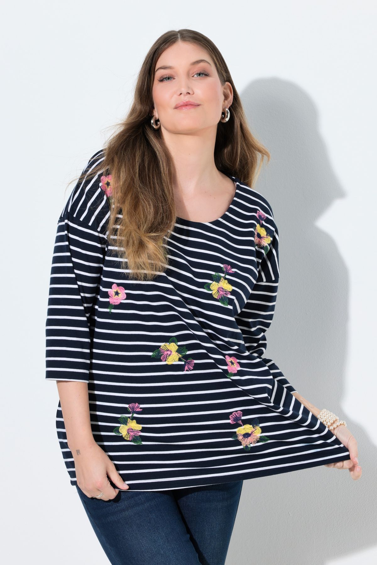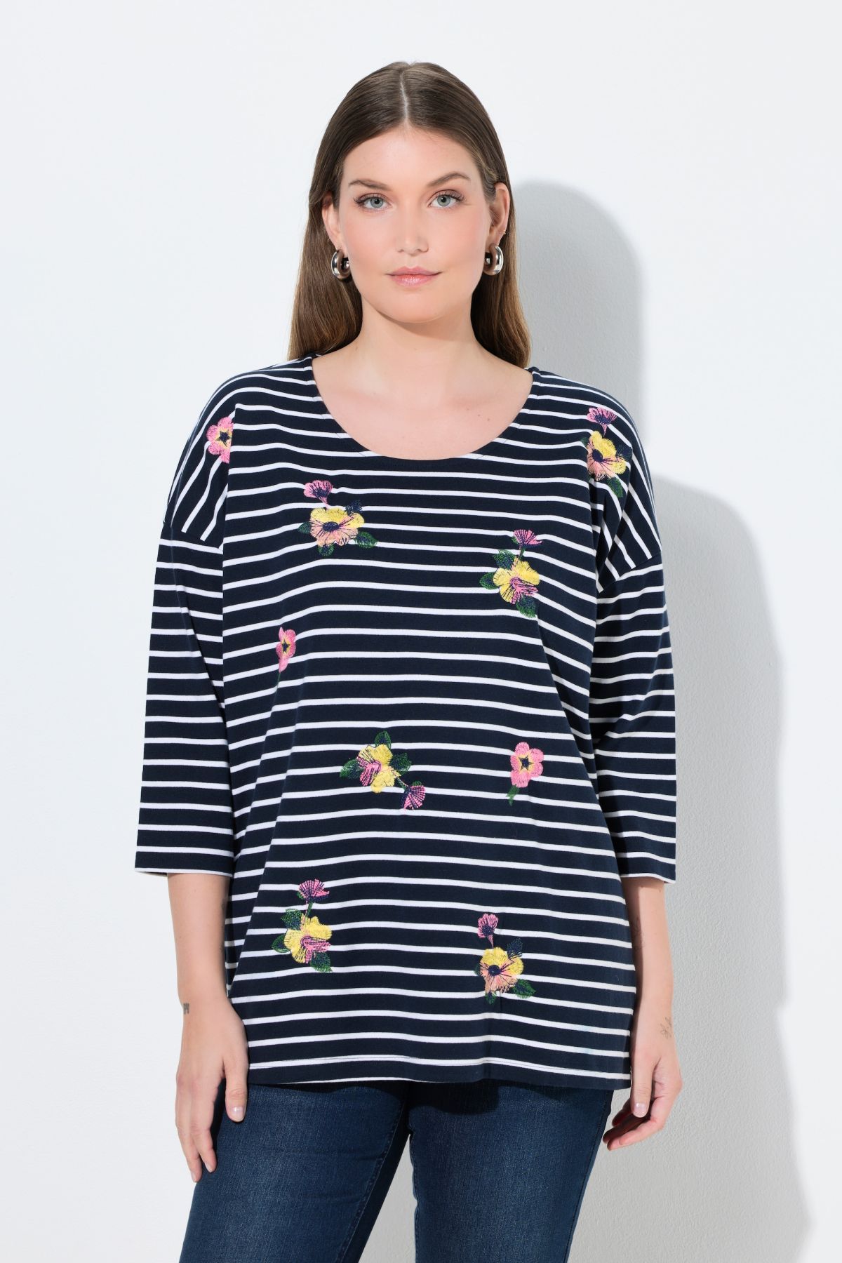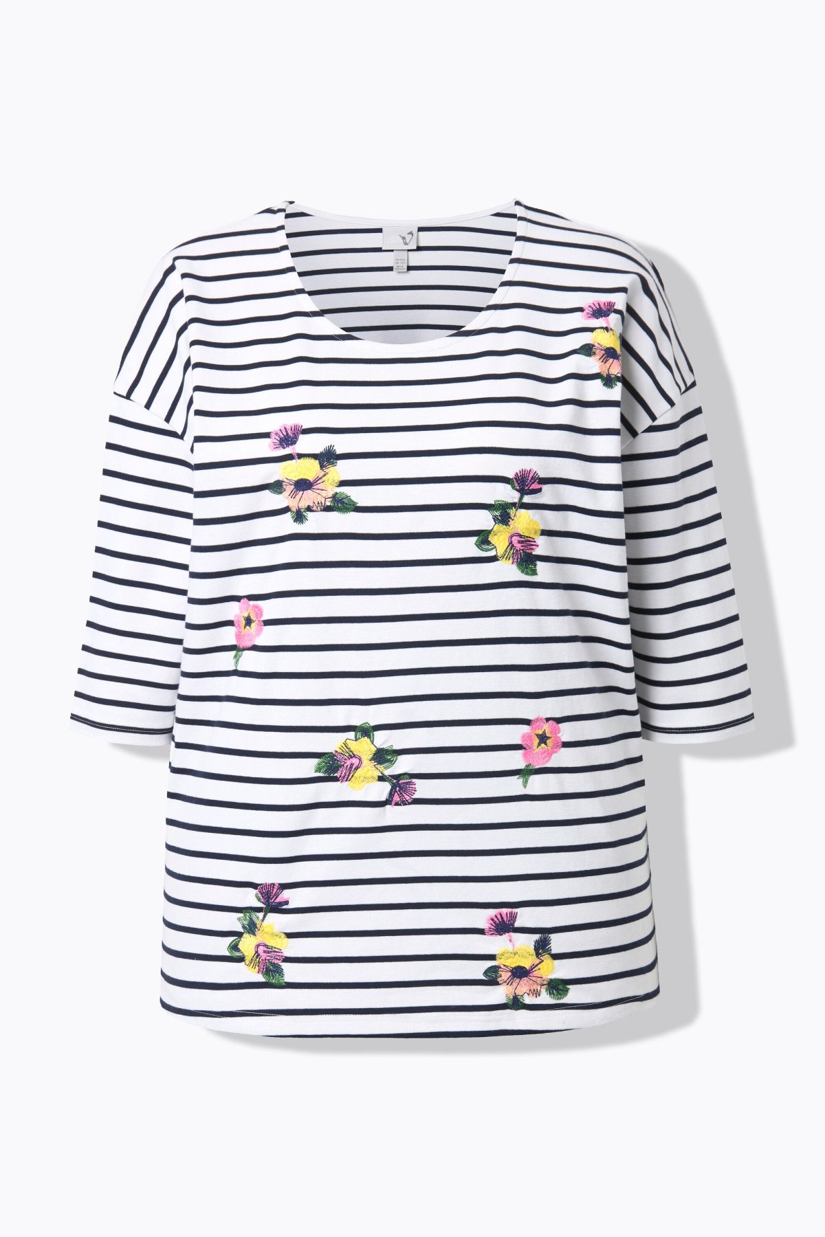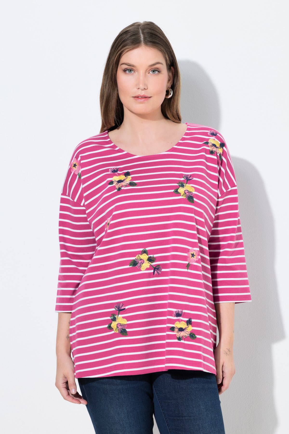 T-shirt oversize à rayures, broderies, col rond et manches 3/4