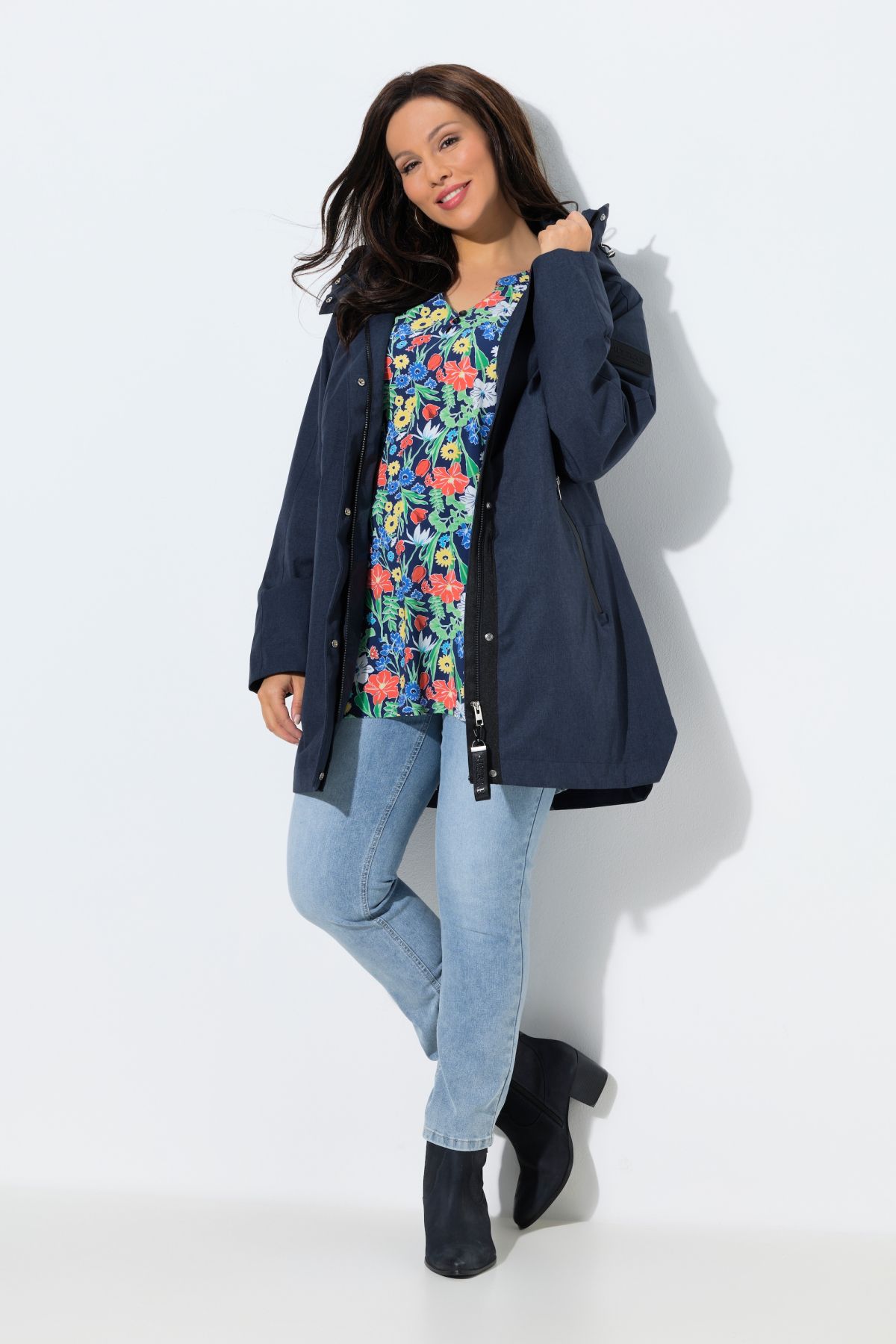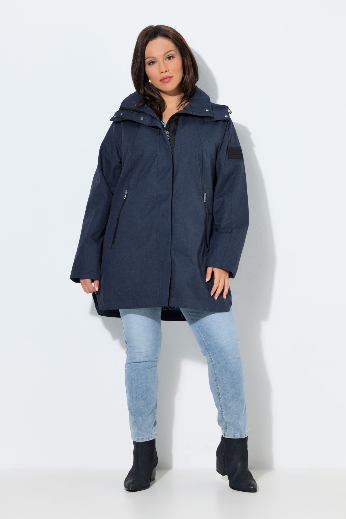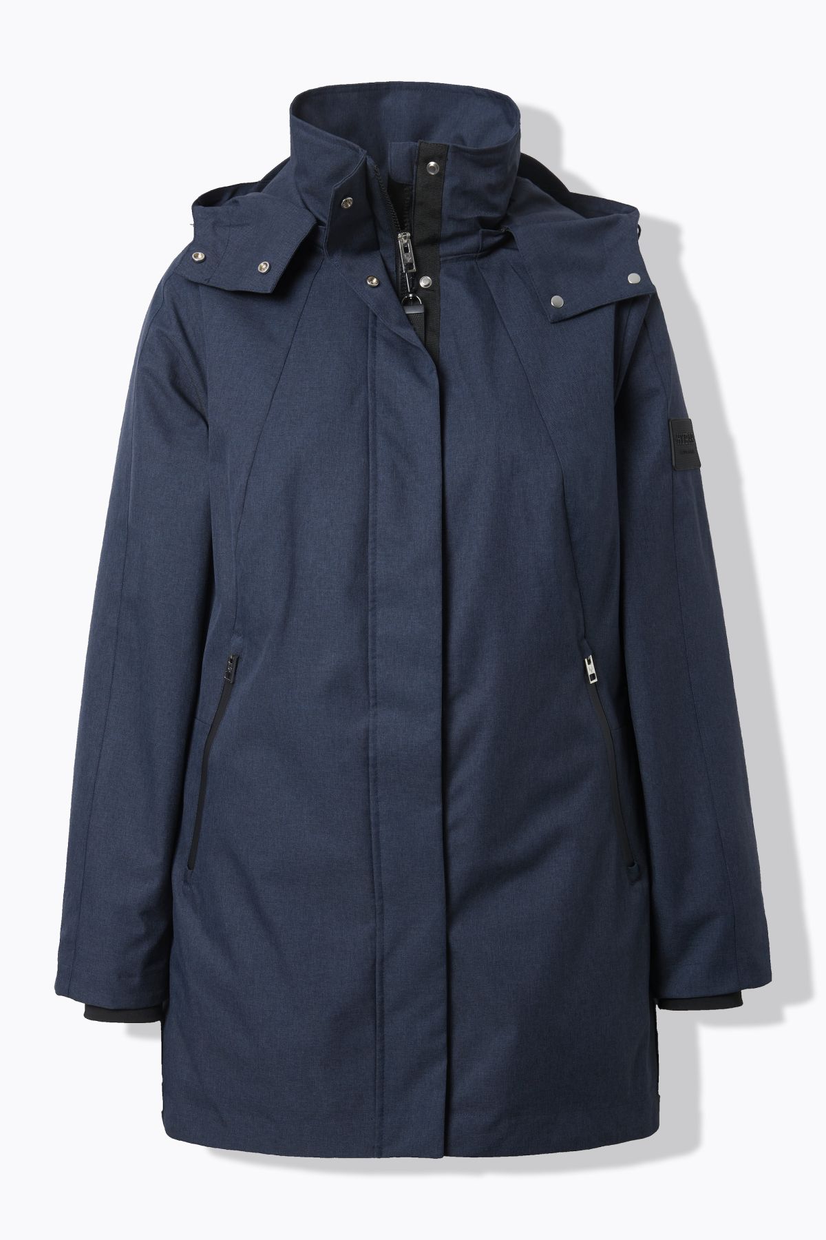 Modèle imperméable (colonne d'eau de 10 000 mm), coupe-vent et respirant, Col montant avec capuche amovible, Poches zippées imperméables, Fermetures à glissière sur les côtés (à la base de la veste), Doublure intégrale imprimé sportif, avec poche, Long. s