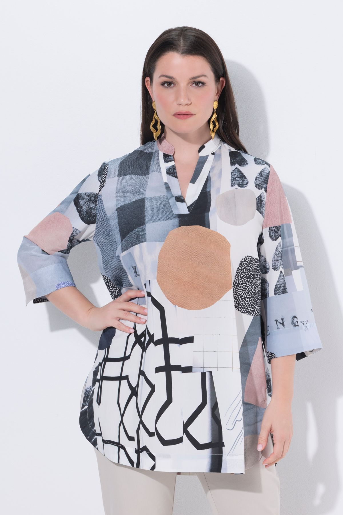 Motif cœurs graphique, Col montant avec encolure esprit tunique, Base arrondie avec fente sur les côtés, Manches 3/4 se terminant par une fente triangulaire, Lyocell naturellement doux et confortable, Long. selon taille env. 82-86 cm.