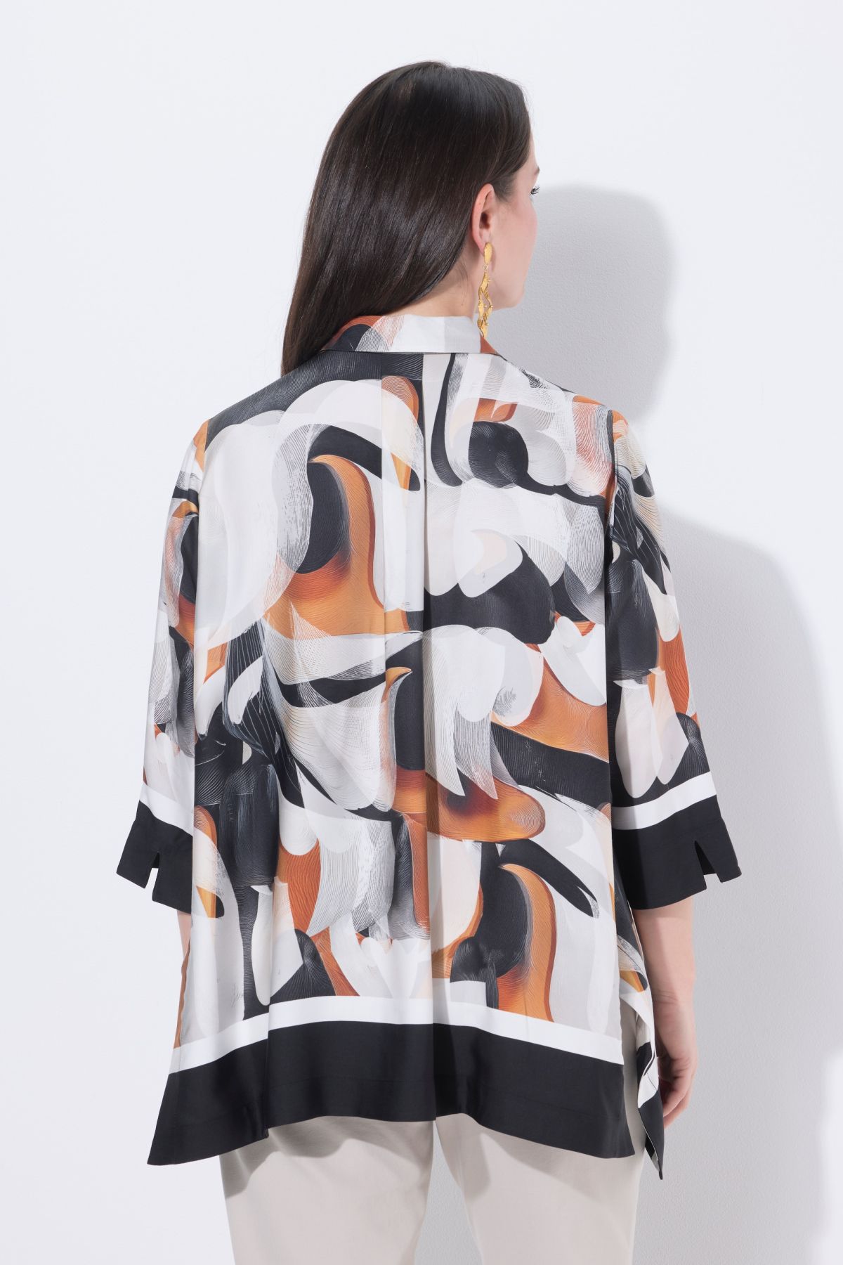 Motif graphique, large bordure à la base et aux extrémités des manches, Patte de boutonnage sous patte à rayures, Coupe oversize décontractée, finition en pointes, fente de chaque côté, Manches 3/4 fendues, Viscose d'une très grande douceur, Long. selon t