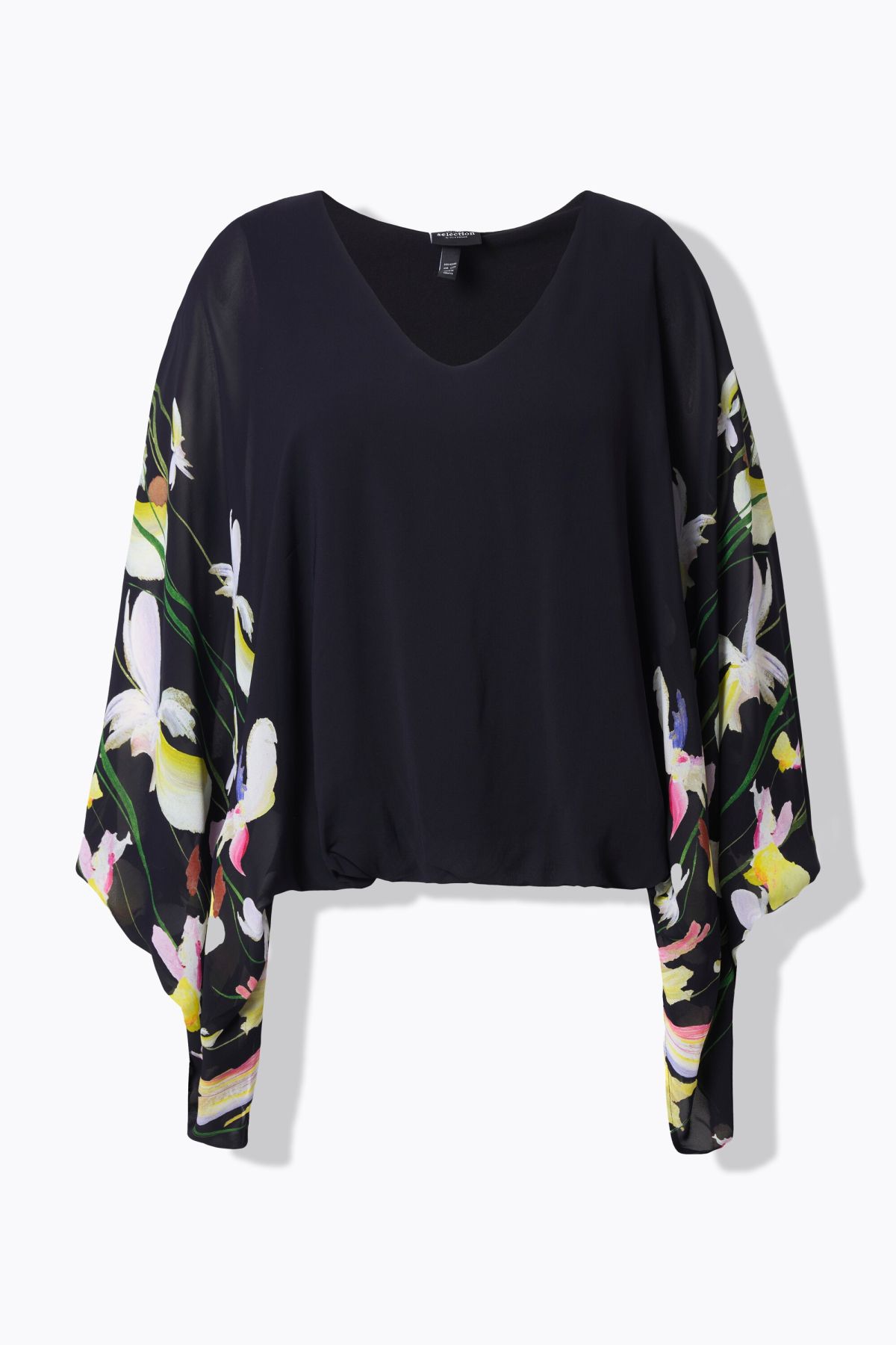 Voile en mousseline aérienne, motif floral sur les manches, Décolleté en V, Coupe oversize décontractée, bordure en jersey à la base, Manches 3/4, Top opaque en dessous, Long. selon taille env. 64-72 cm.