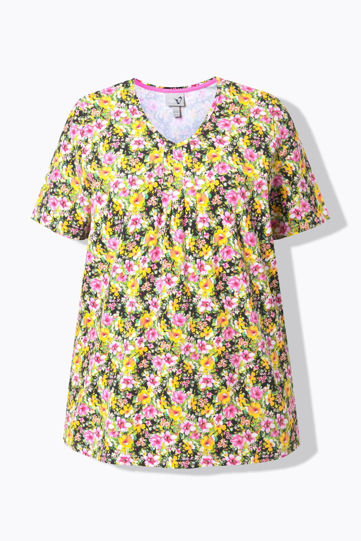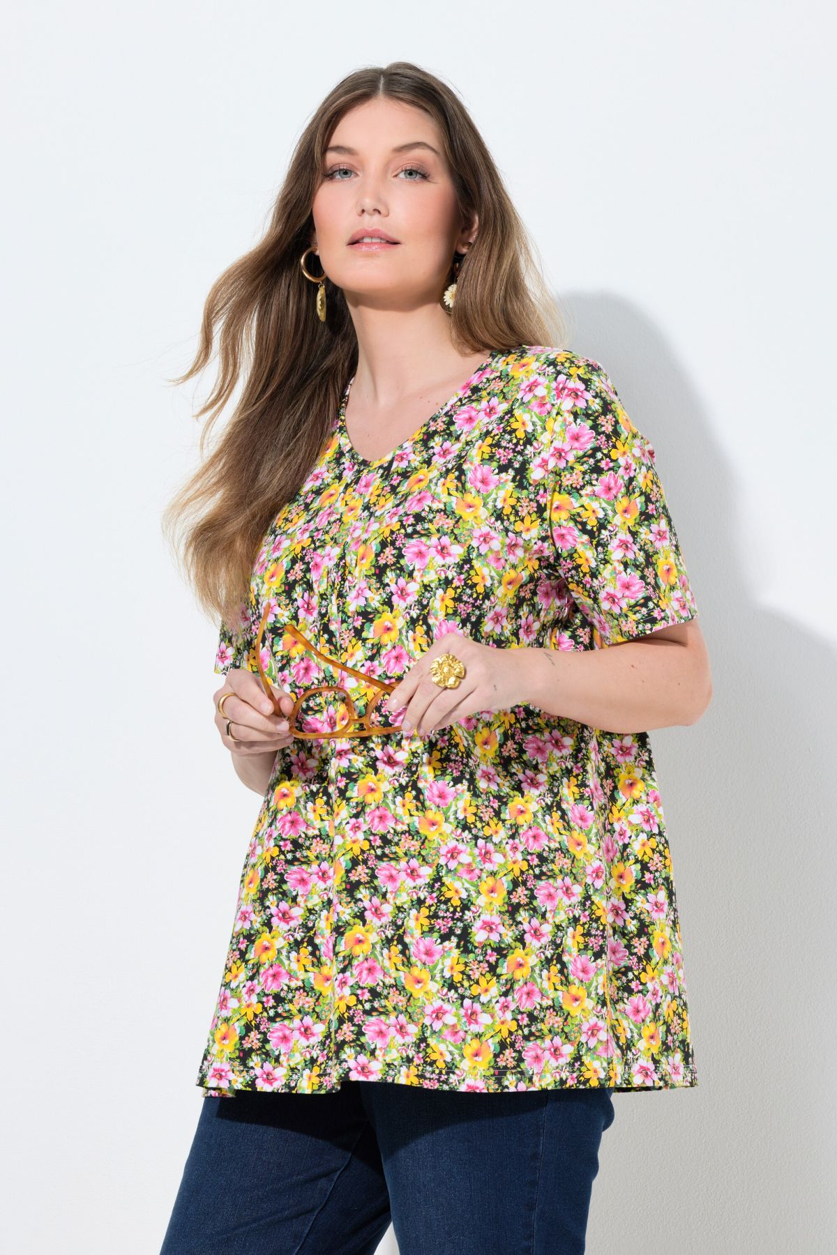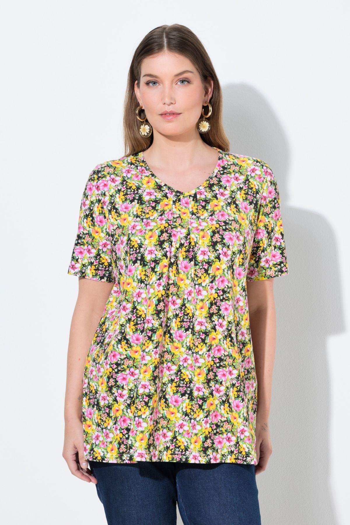 Motif floral raffiné, Décolleté en V se terminant par des plis fantaisie, Coupe évasée confortable, Manches courtes, Coton naturel enrichi en élasthanne, Long. selon taille env. 72-76 cm.