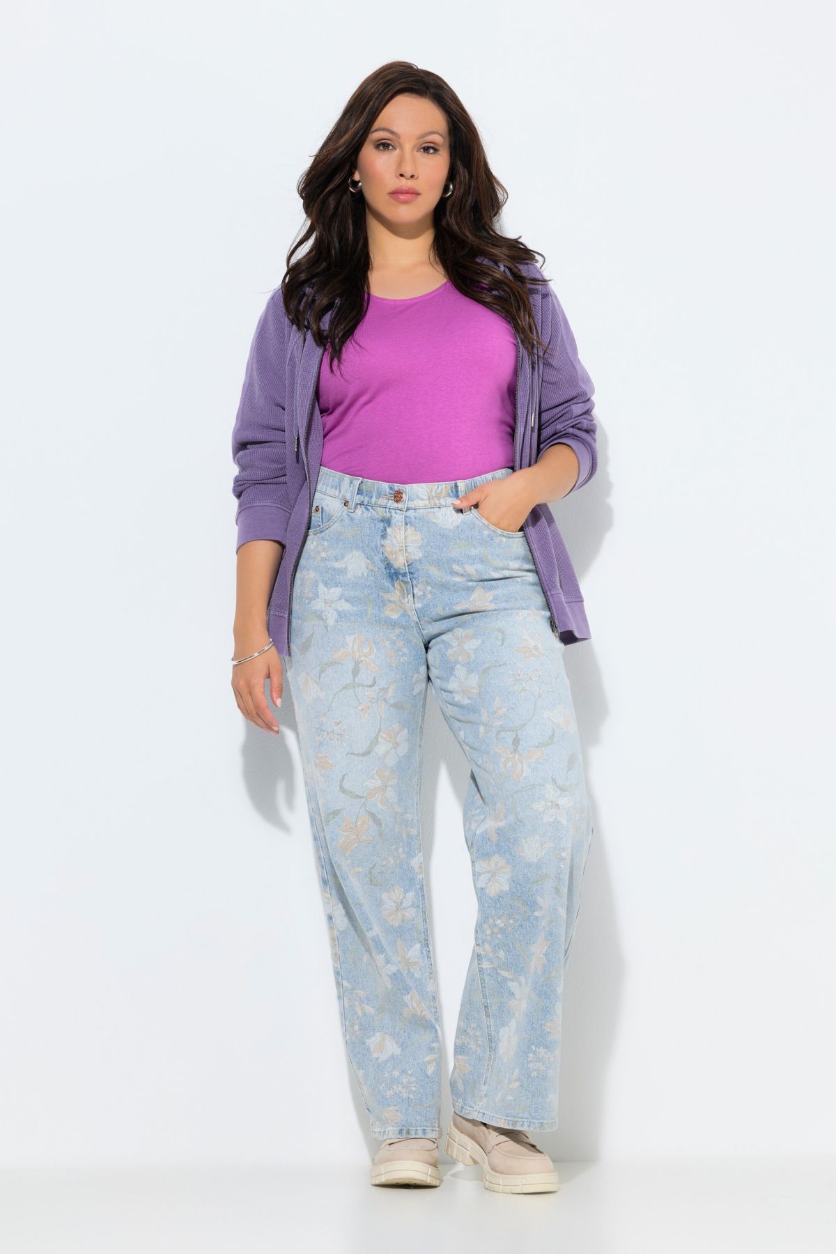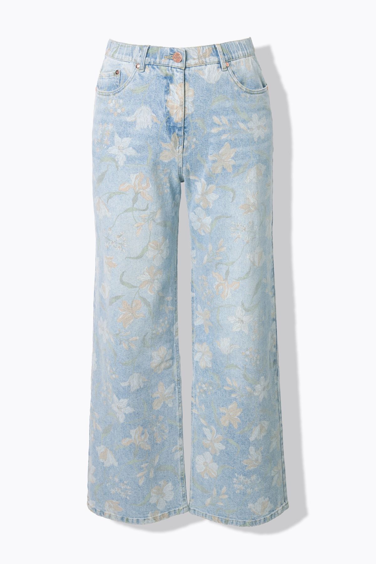 Motif floral tendance, Modèle Mary, jambe large et droite, Modèle confortable, 5 poches, Passants pour ceinture, Tissu denim agréablement élastique, Entrej. env. 82 cm.