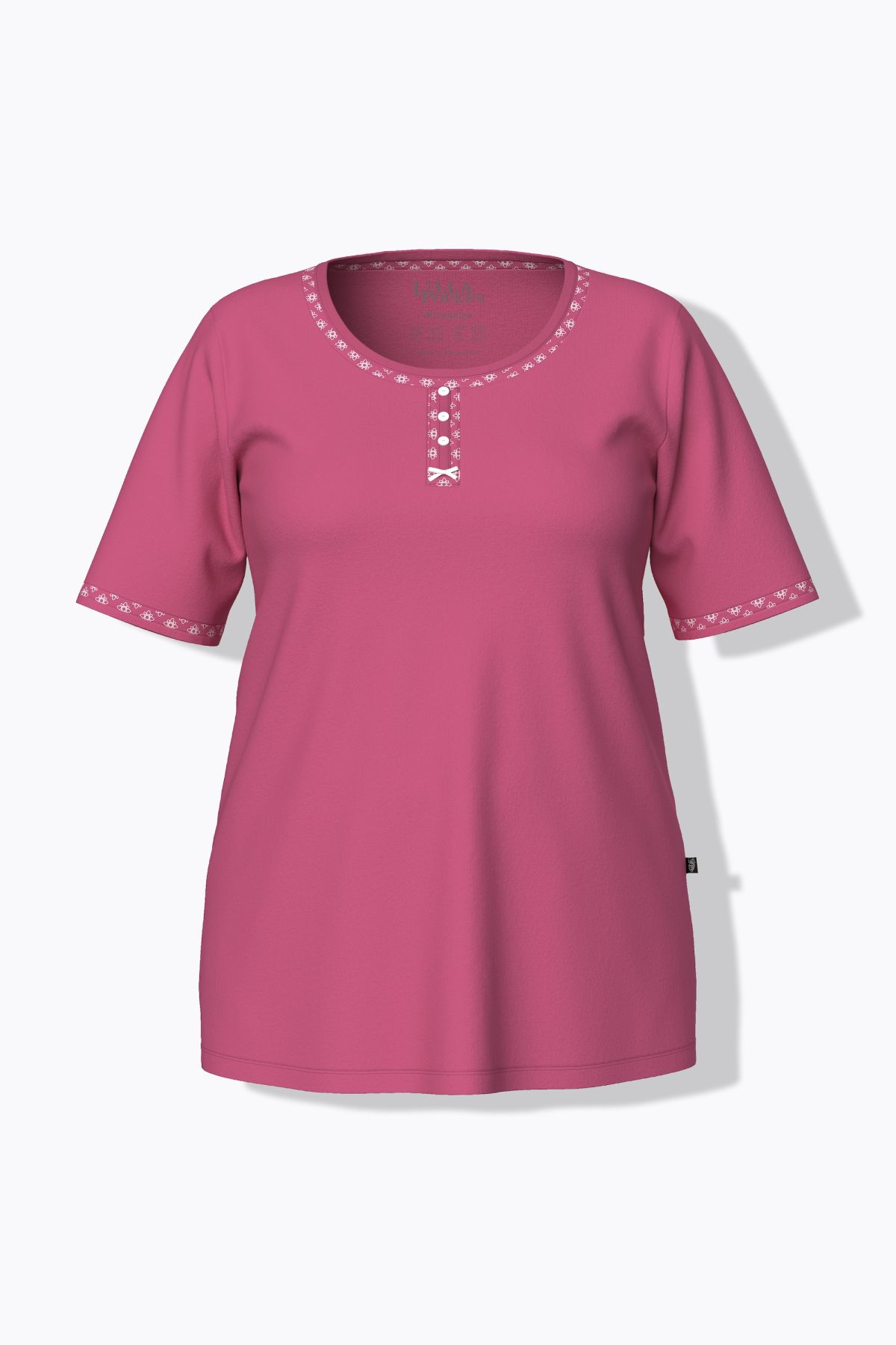 T-shirt de couleur unie, petits détails dans un tissu à motif, Décolleté rond avec patte de boutonnage fantaisie, Pantalon long avec le même motif, taille élastique, Poches sur les côtés, Coton respirant, idéal pour la nuit, Long. selon taille env. 72-76