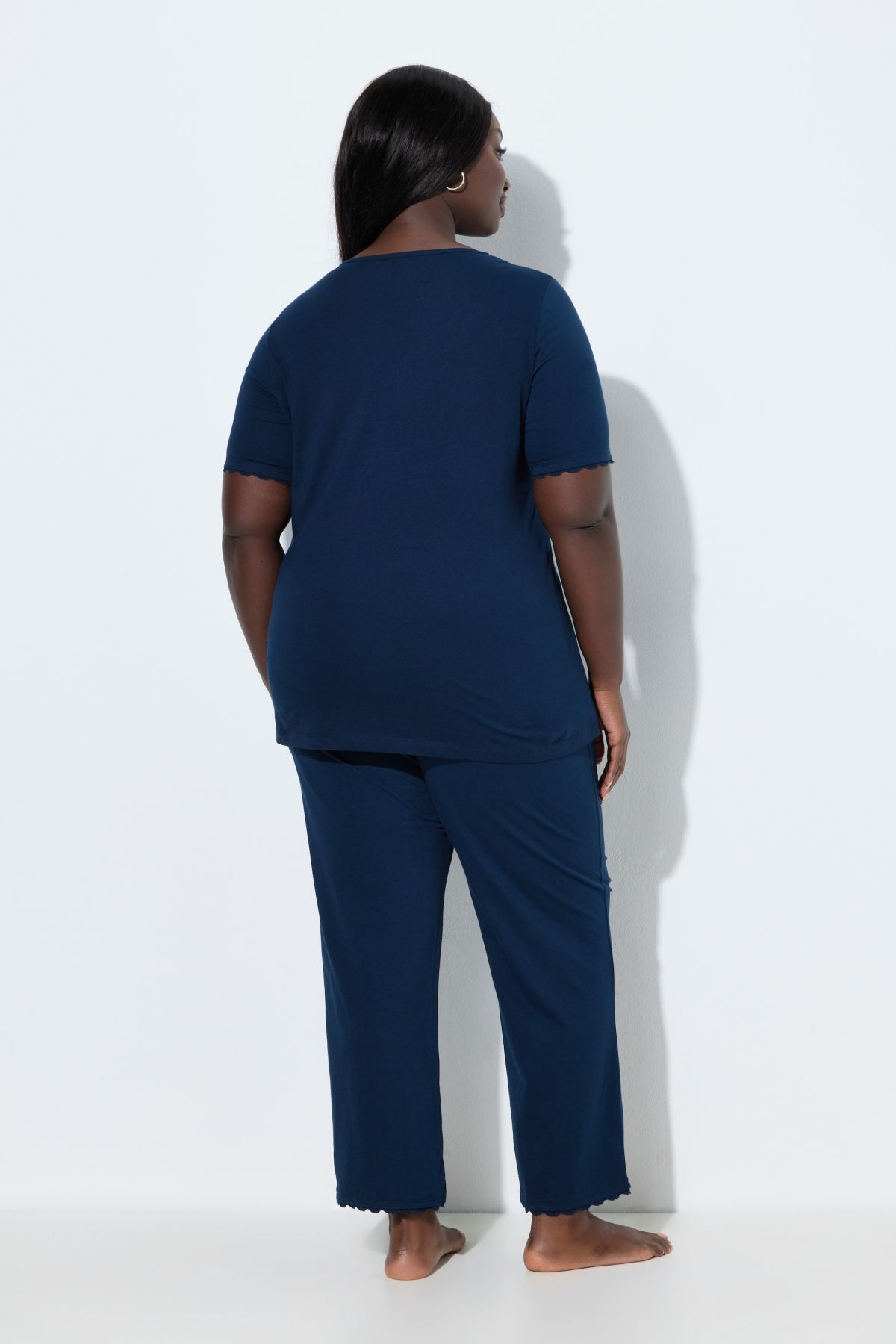 Liseré en dentelle autour du décolleté et aux extrémités des manches du T-shirt, ainsi que sur le bas de jambe du pantalon, Décolleté en V, Pantalon droit à taille élastique, Poches sur les côtés, Coton bio durable, Long. selon taille env. 72-76 cm.
