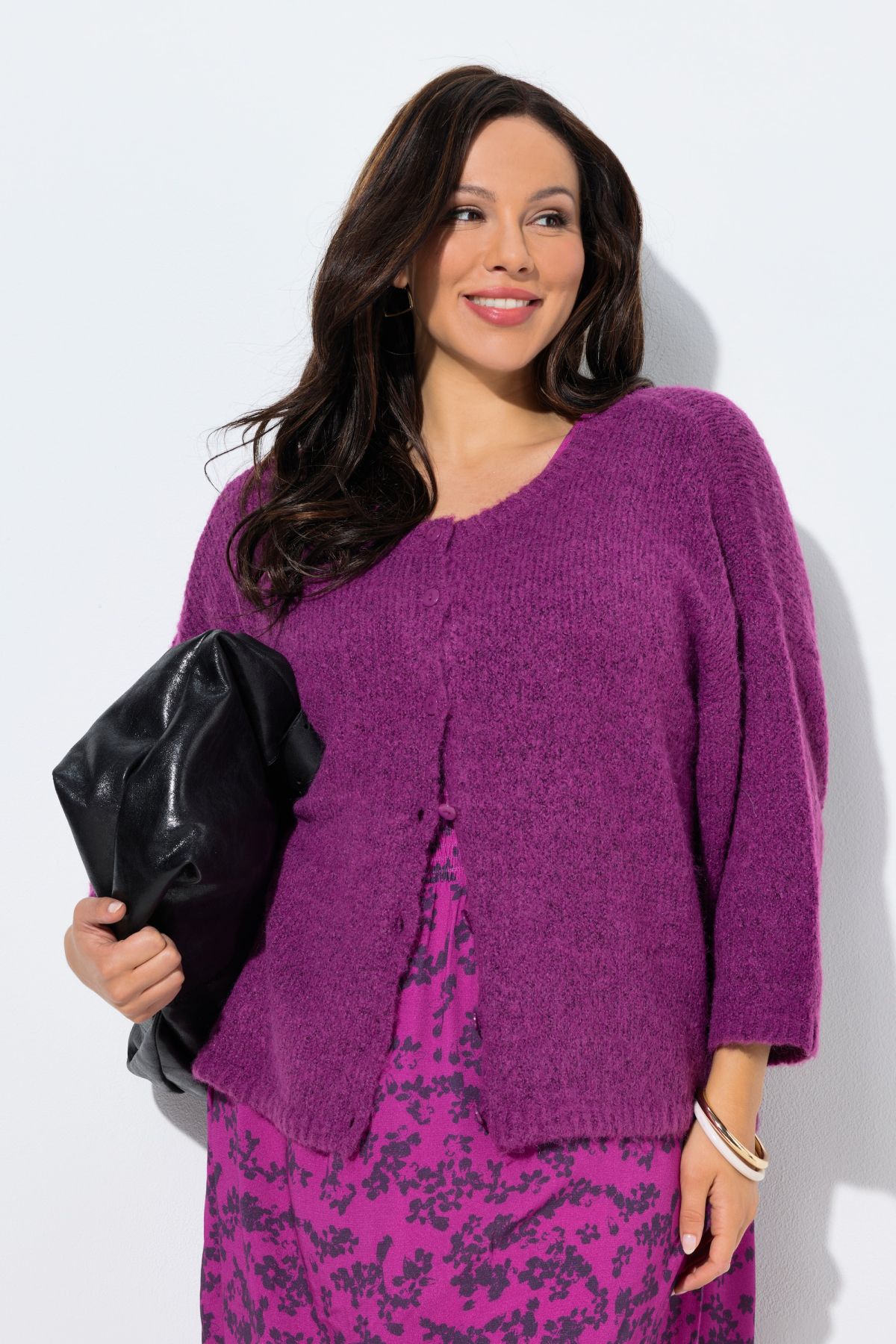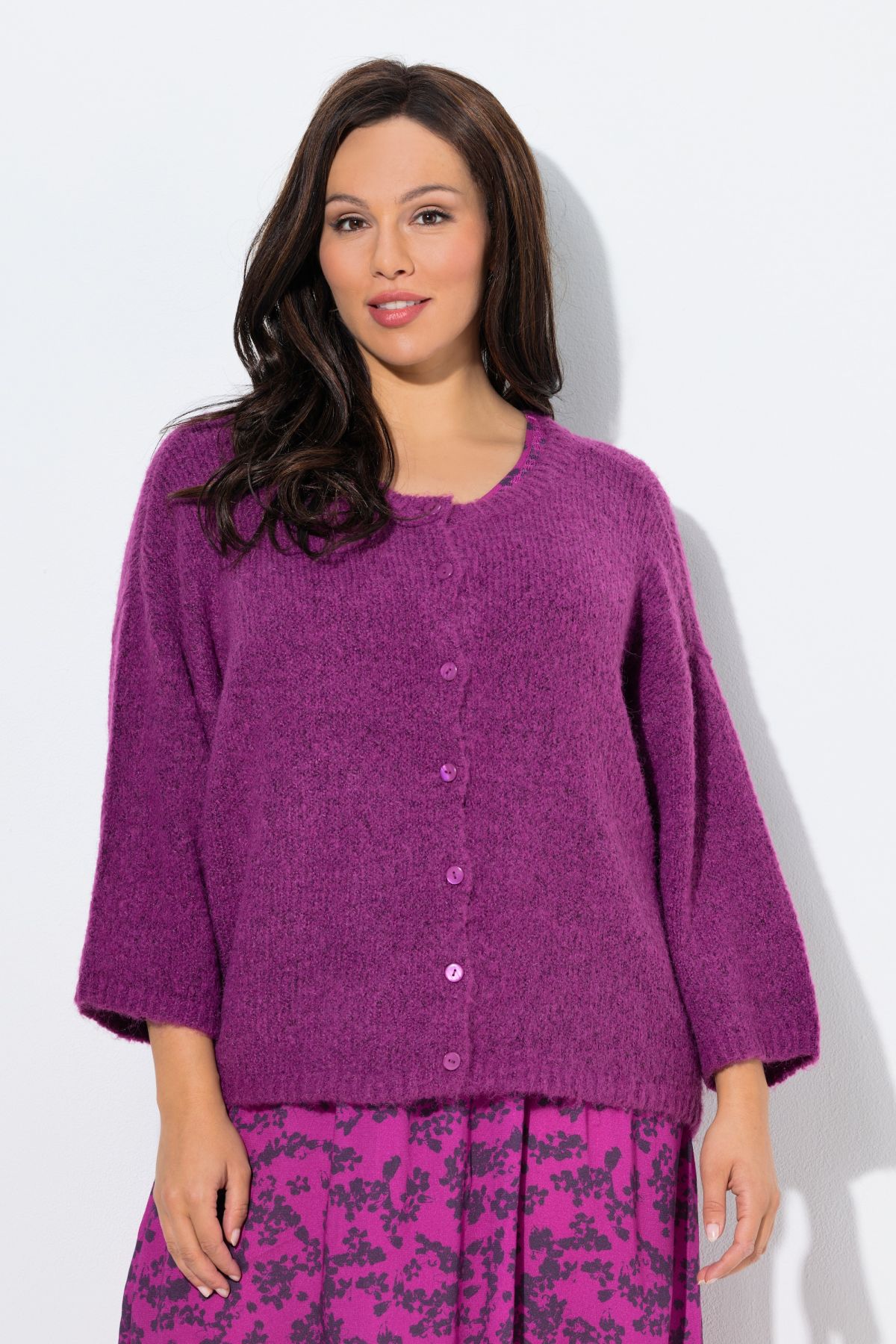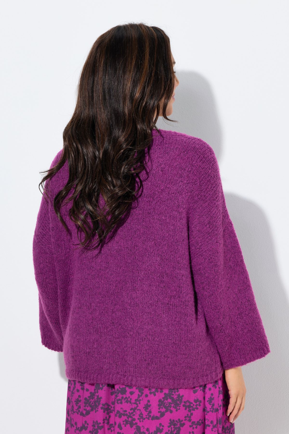Maille fantaisie, douce et confortable, Col rond, Modèle oversize décontracté, Patte de boutonnage, Manches 3/4 très amples, finitions bords-côtes aux extrémités des manches et à la base, Long. selon taille env. 60-70 cm.