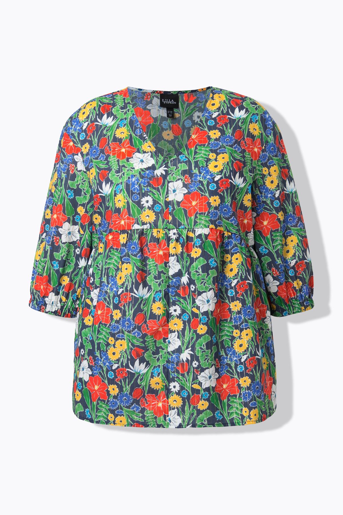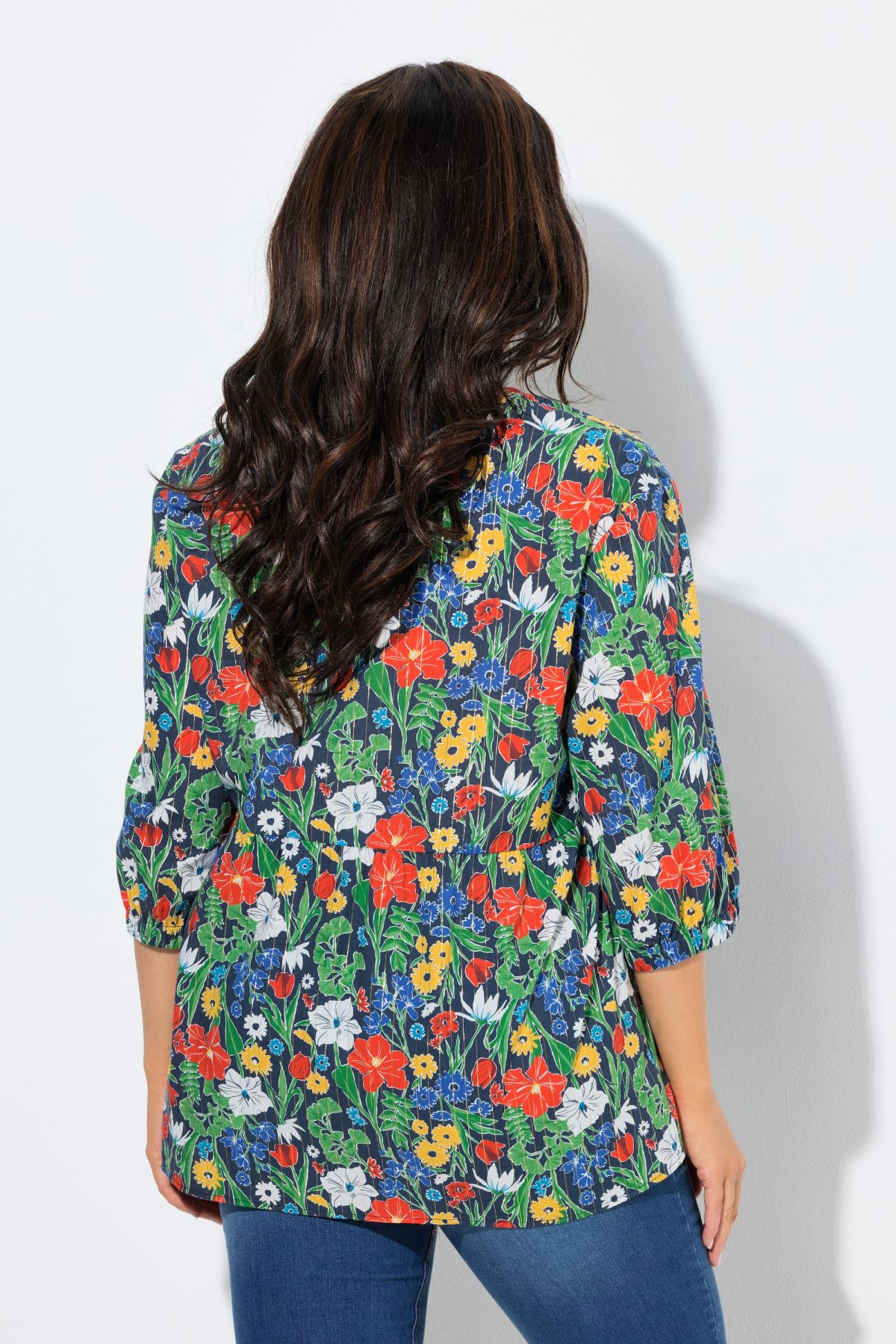 Motif floral avec fines rayures en fil doré scintillant, Décolleté en V, Coupe évasée, base ample et confortable, Couture horizontale froncée, Manches 3/4 avec finition élastique, Long. selon taille env. 72-76 cm.
