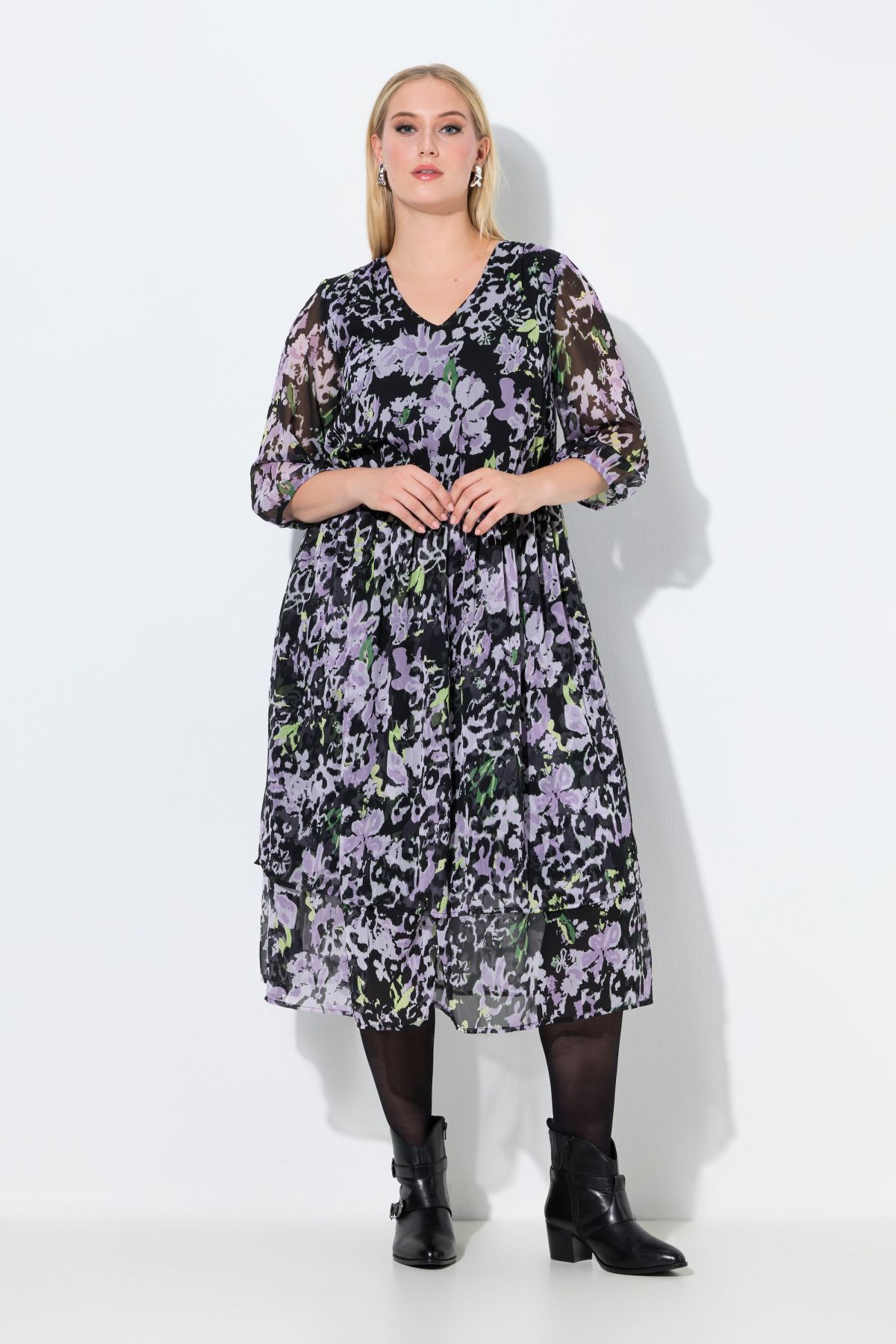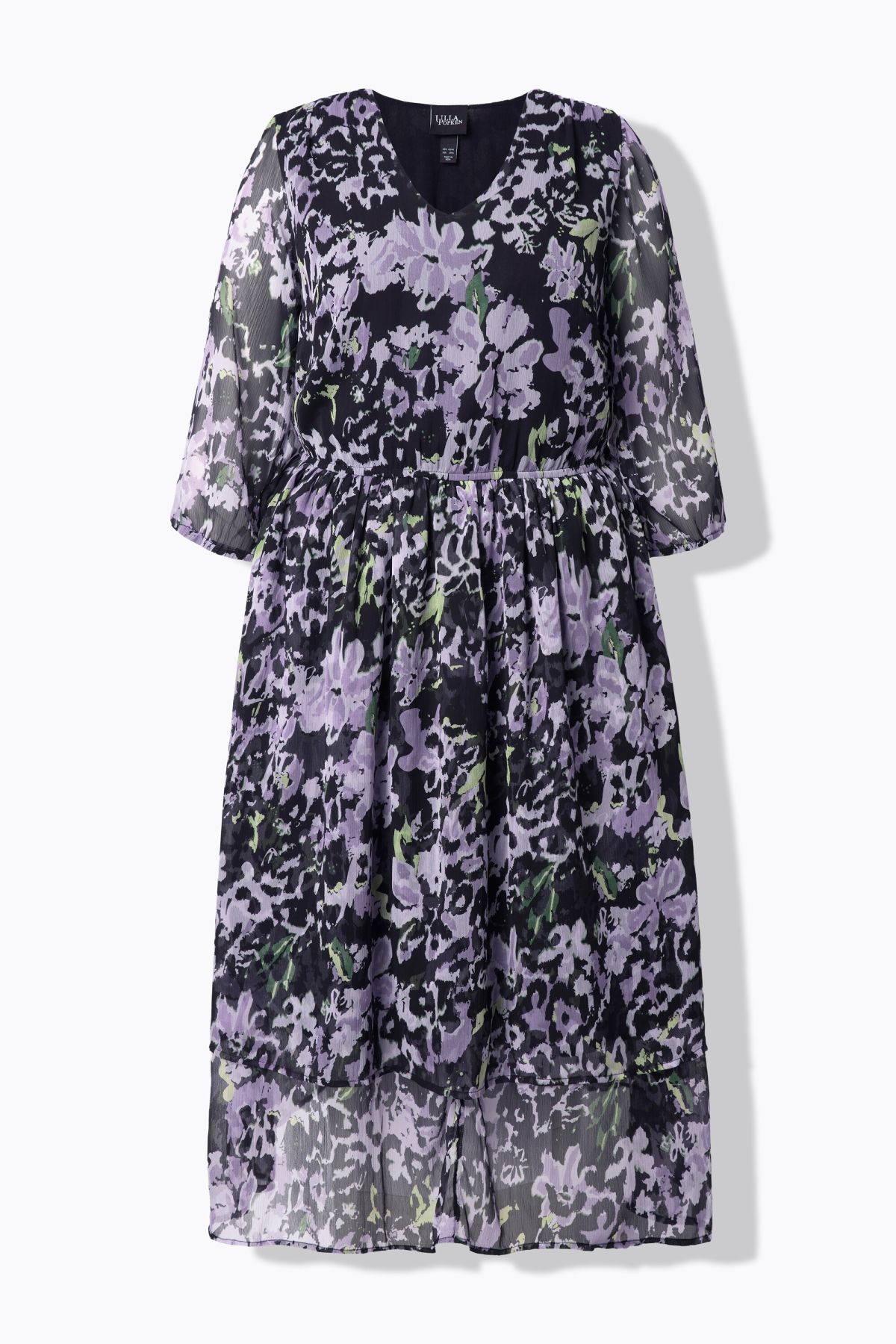 Voile en mousseline légère, motif floral, Décolleté en V, Coupe évasée confortable, taille élastique, Robe double épaisseur, plusieurs niveaux dans un esprit « volants », Fond de robe opaque, Long. env. 120 cm.