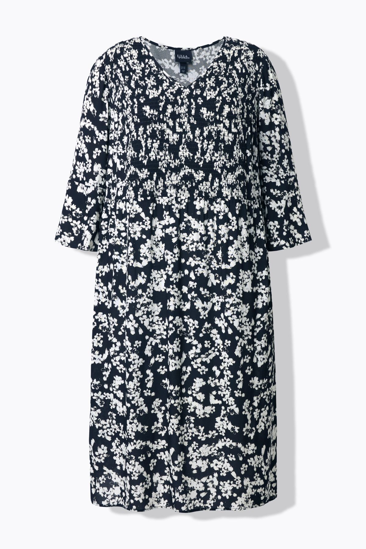 Charmant motif floral, empiècement smocké, Décolleté en V, Coupe évasée confortable, taille élastique, Manches 3/4 volantées, Crêpe de viscose au tombé fluide, Long. env. 110-114 cm.