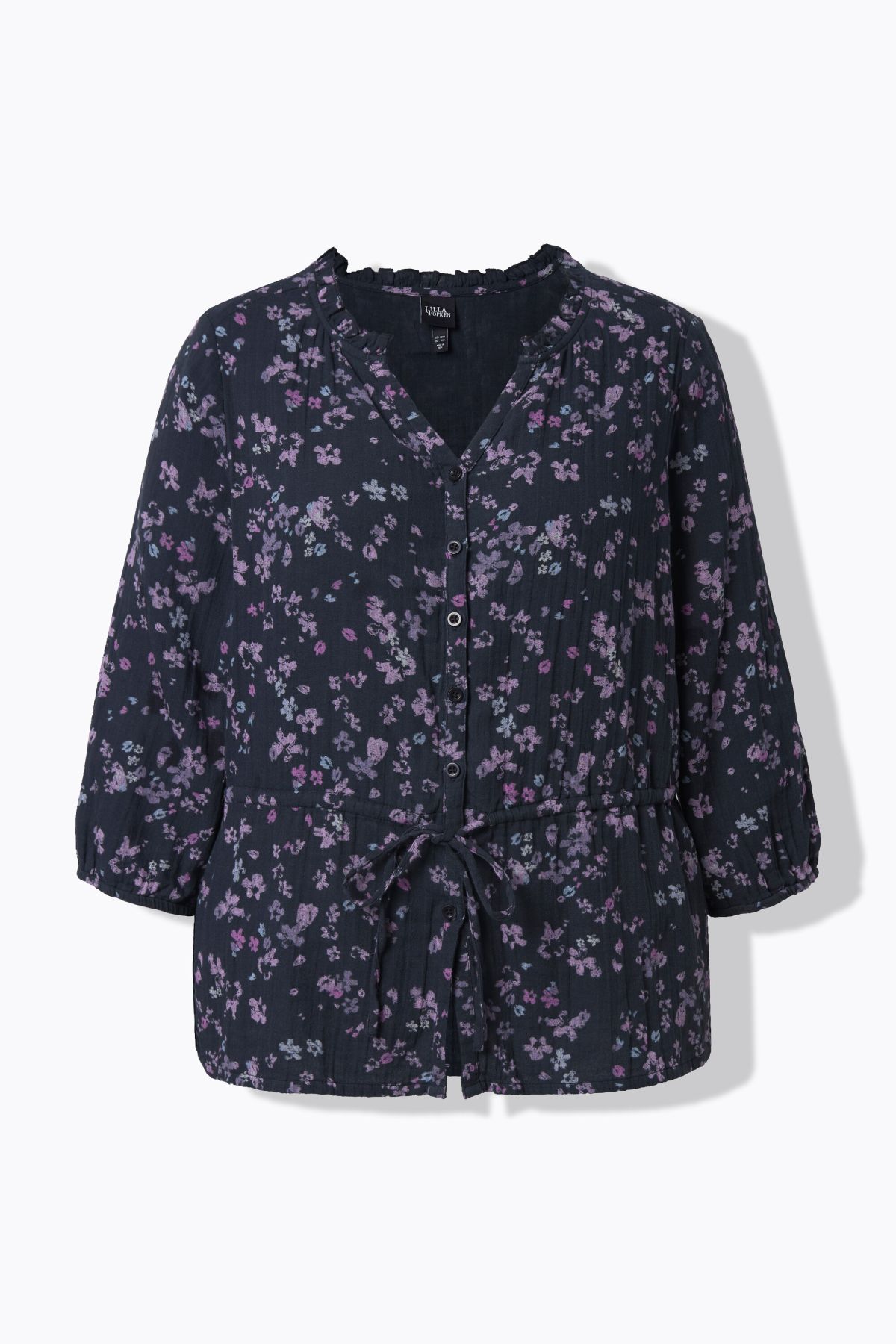 Mousseline délicatement texturée et motif à fleurs, Décolleté en V avec petits ruchés, Coupe évasée confortable, avec large volant à la base, Manches 3/4 avec finition élastique, Pur coton, Long. selon taille env. 62-72 cm.