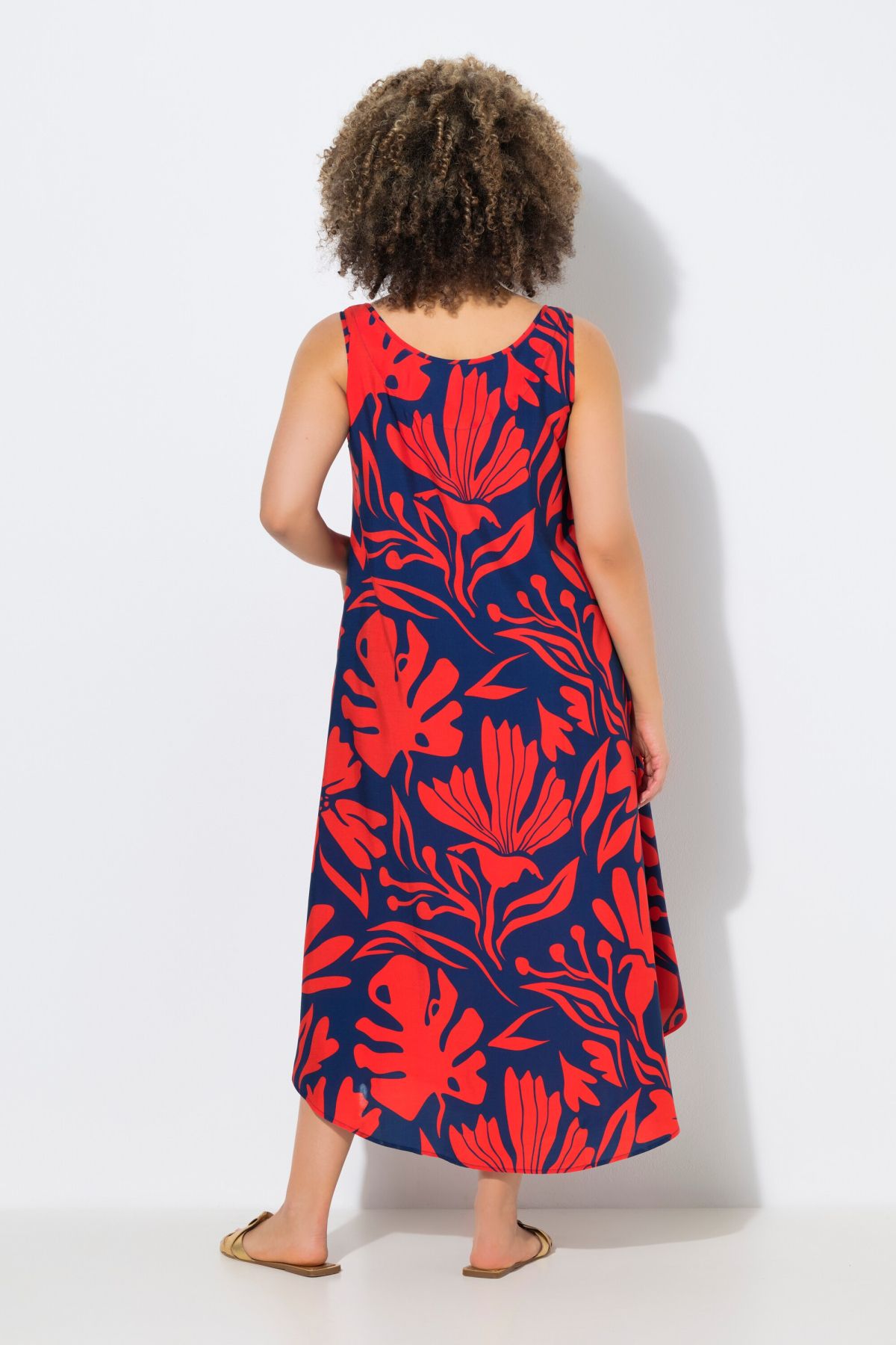 Robe midi sans manches, motif coraux, décolleté rond et coupe évasée
