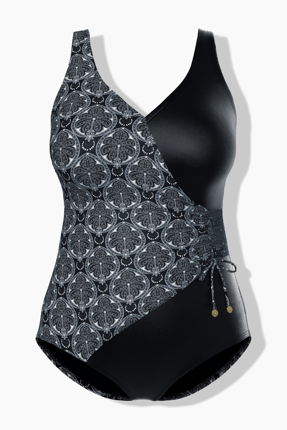 Esprit cache-cœur très féminin grâce à son jeu de motifs, Nœud fantaisie sur le côté, à hauteur de taille, Bonnets souples et bande de soutien sous la poitrine, Doublure poitrine douce et confortable, Contient du polyamide recyclé, plus respectueux de l'e