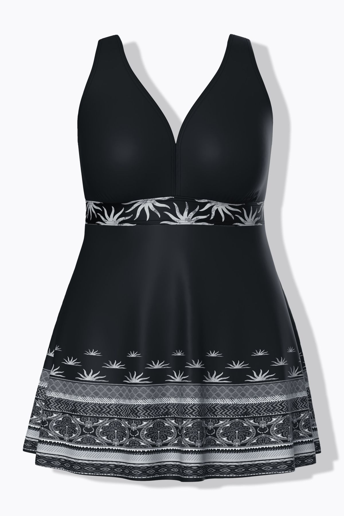 Bande fantaisie avec motif soleils sous le buste, motifs géométriques à la base, Robe de bain à bonnets souples, maillot de bain intégré, Bande de soutien sous la poitrine, Doublure poitrine douce et confortable, Contient du polyamide recyclé, plus respec