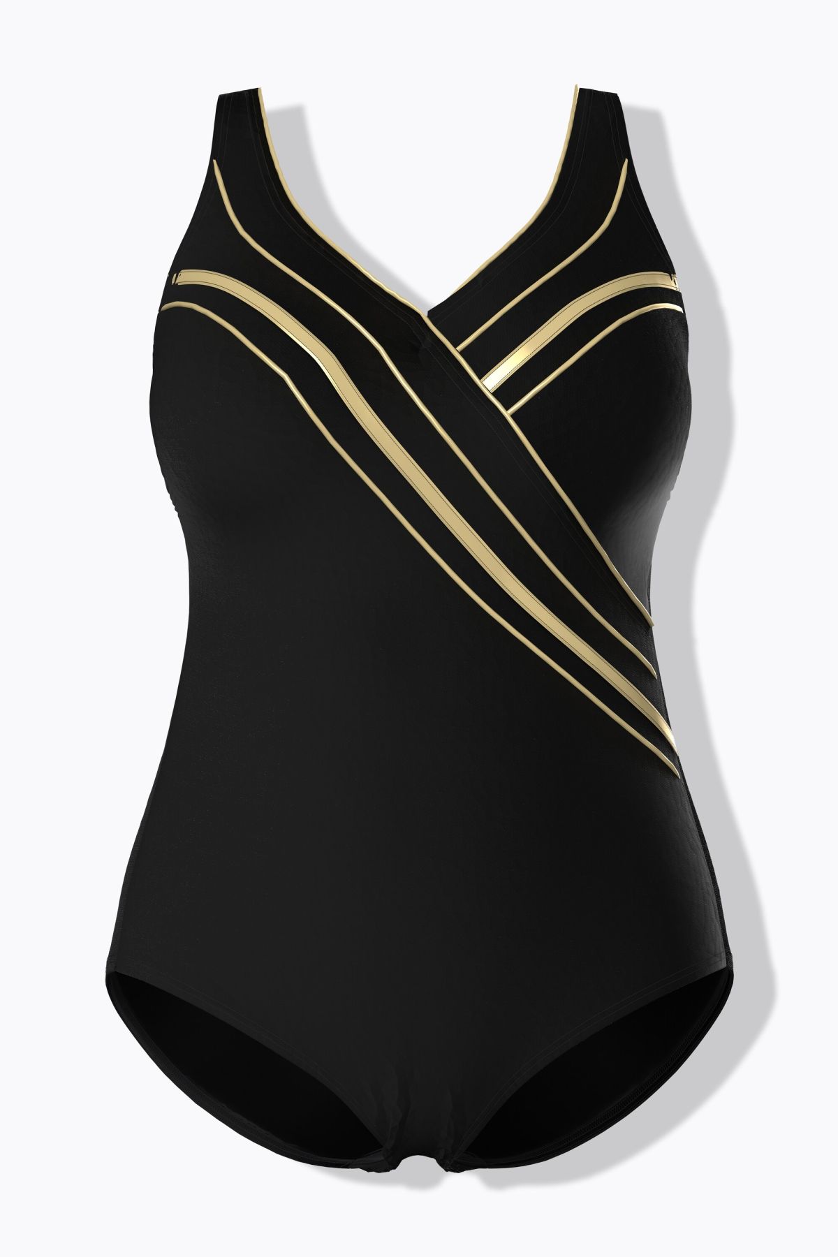 Élégants passepoils dorés, Décolleté en V, effet cache-cœur, Bonnets souples, Bande de soutien sous la poitrine, Doublure poitrine douce et confortable