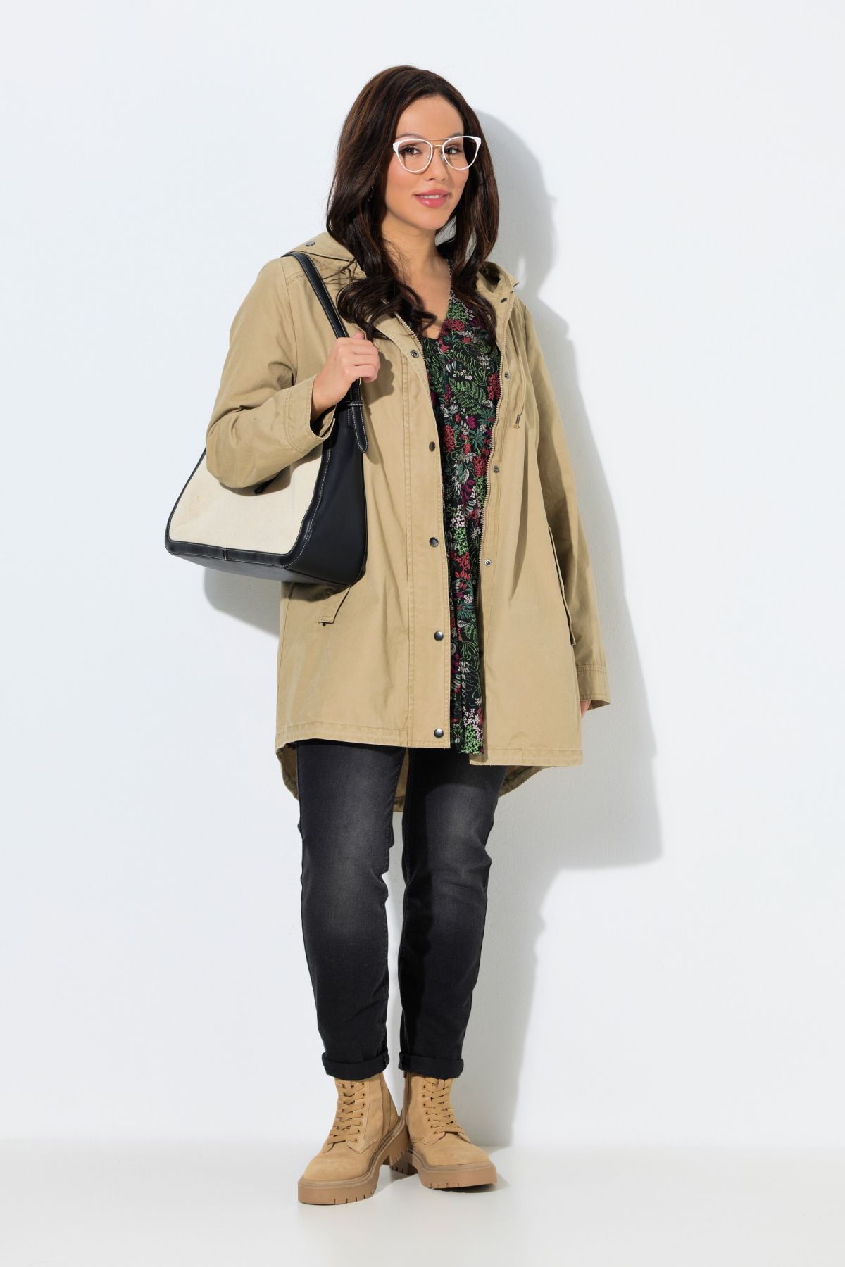 Parka en coton à capuche, plus longue à l'arrière, coupe évasée