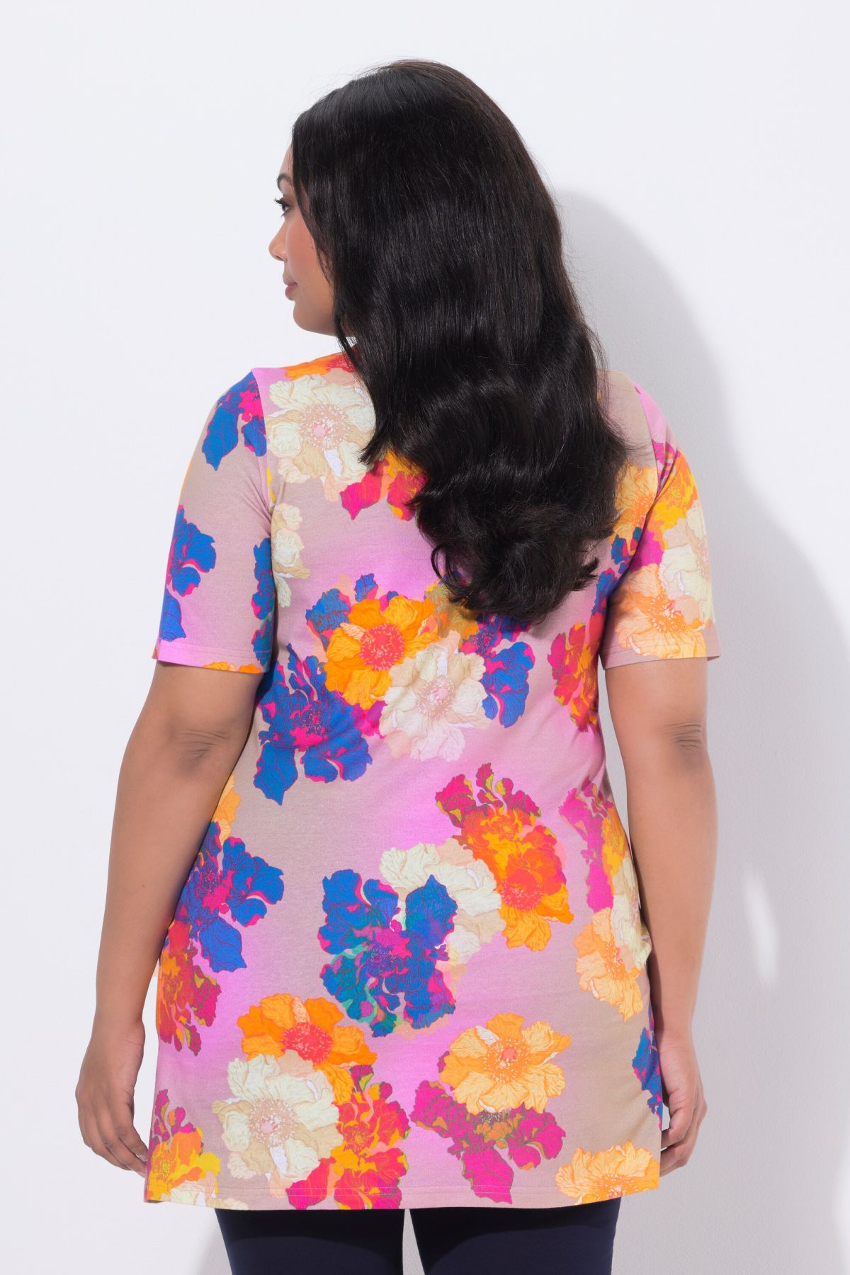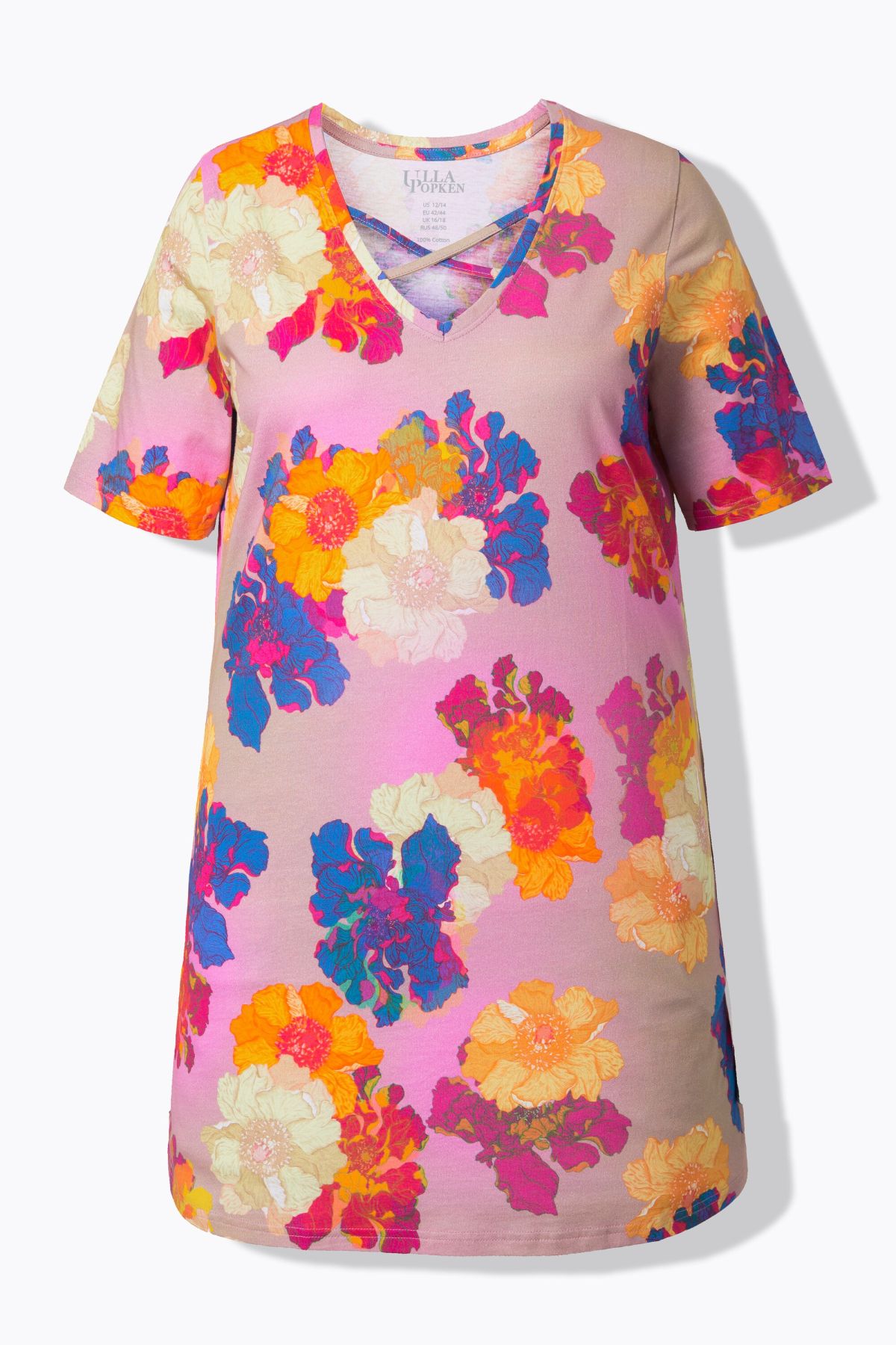 Superbe imprimé floral, Petits rubans fantaisie venant s'entrecroiser sur le décolleté en V, Coupe évasée longue, base agréablement large, Manches courtes, Pur coton, Long. selon taille env. 86 cm.