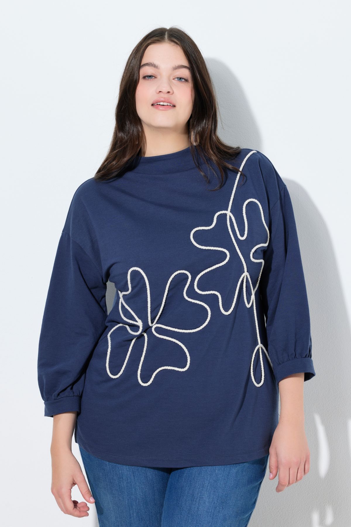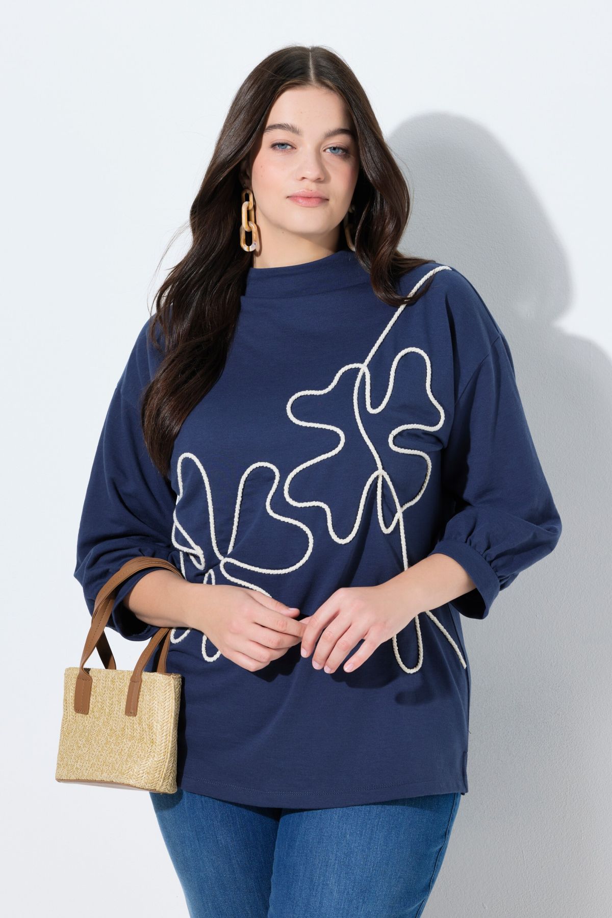 Sweat-shirt en coton bio, trèfles en corde, col montant et manches 3/4