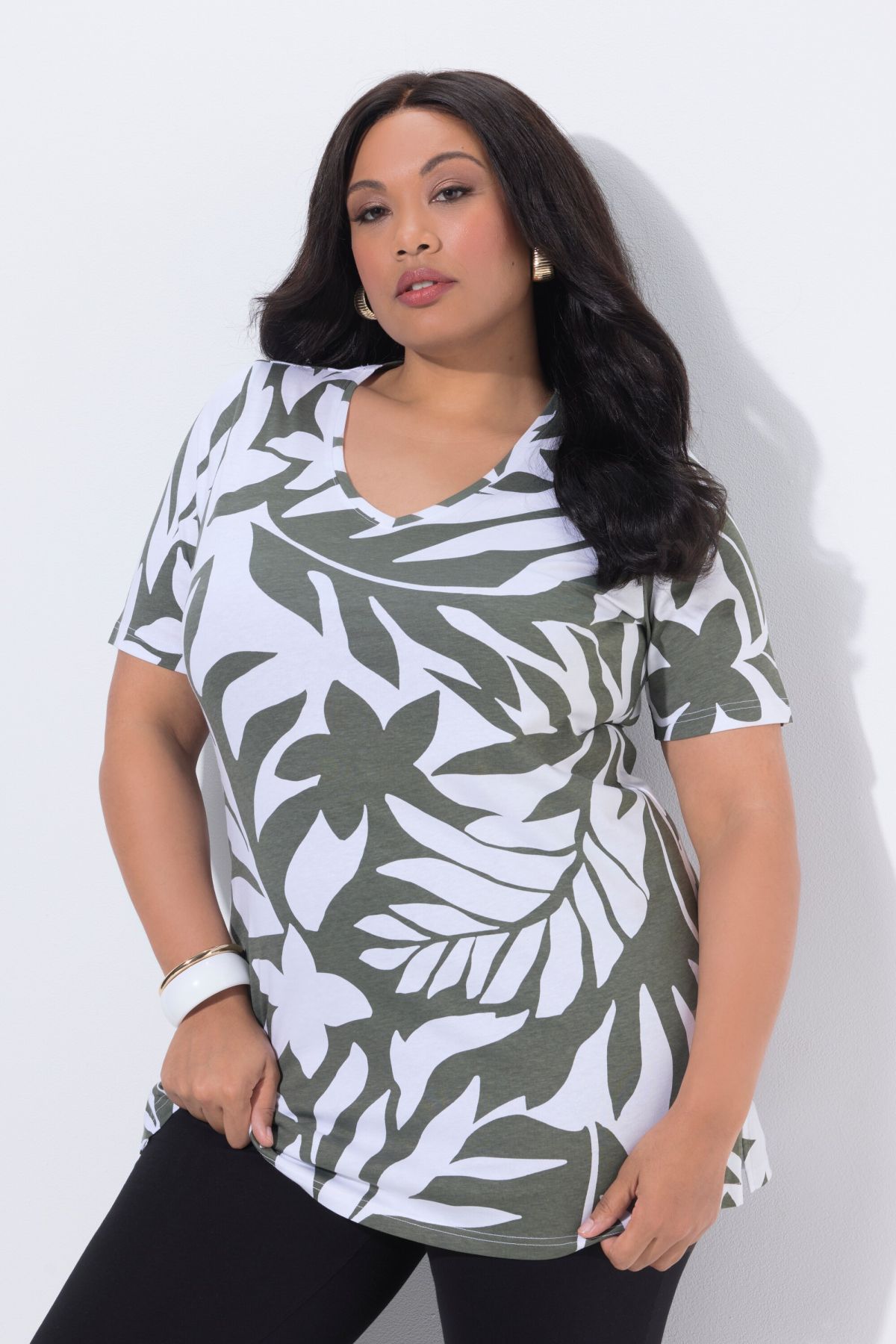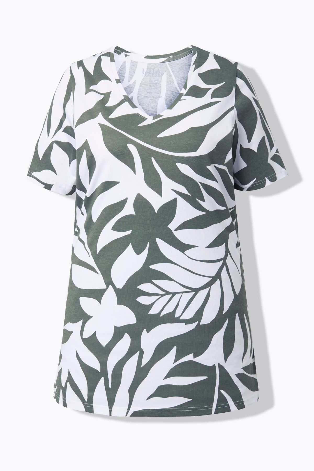 T-shirt long dans un imprimé feuilles, col en V et manches courtes, coupe évasée