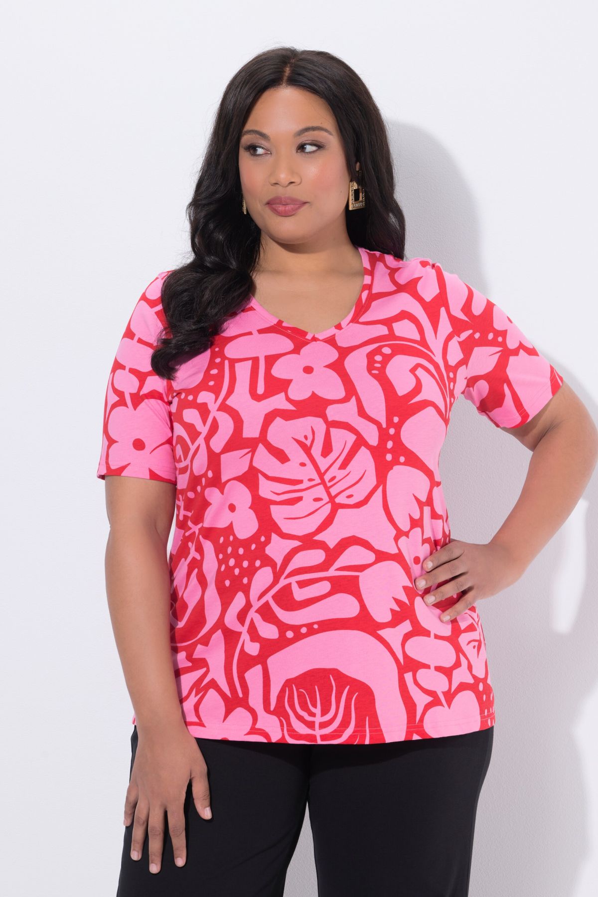 Imprimé graphique tendance, Décolleté en V, Coupe évasée, base ample et confortable, Manches courtes, Pur coton, Long. selon taille env. 71-75 cm.