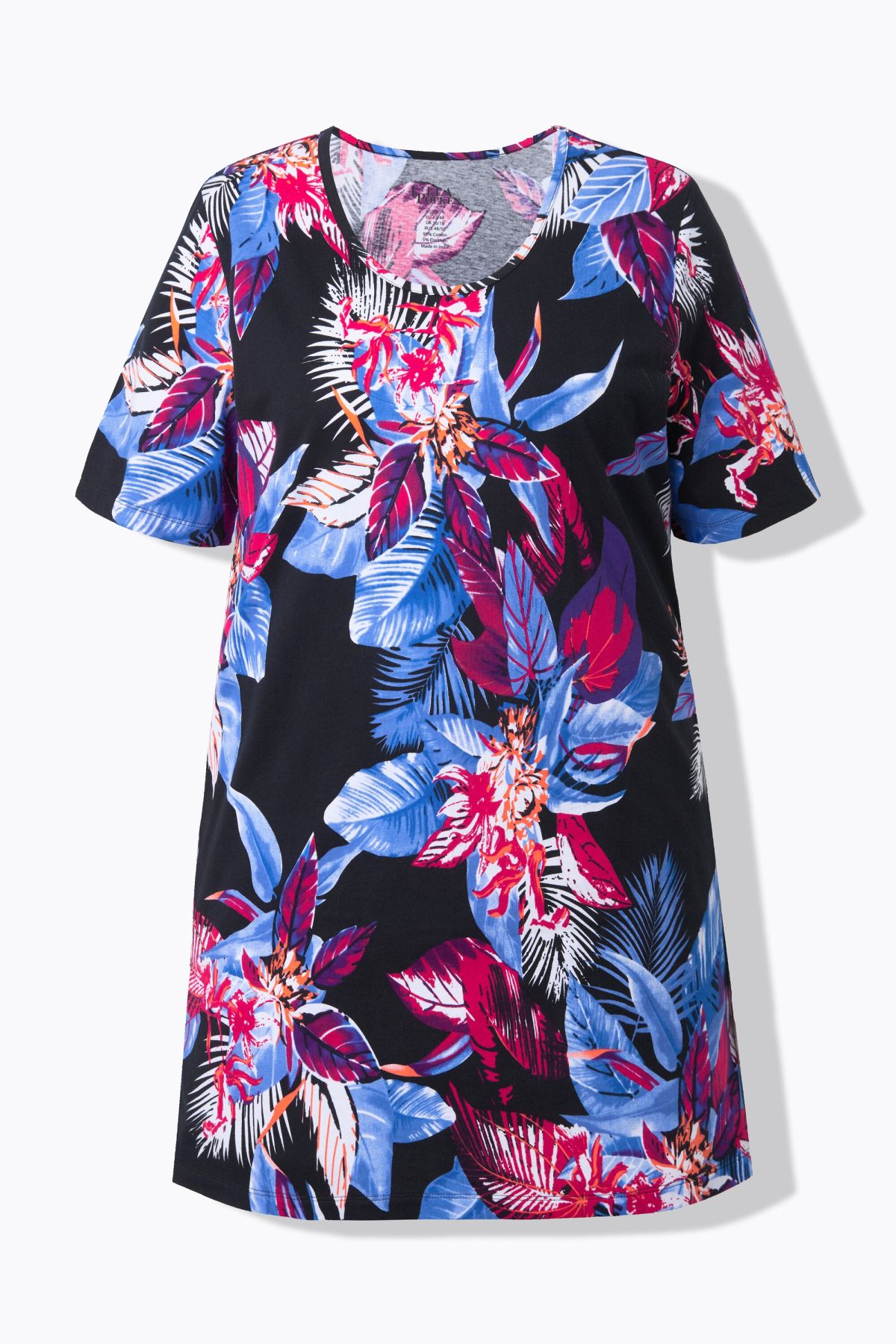 T-shirt long dans un imprimé à fleurs, décolleté rond et manches courtes, coupe évasée