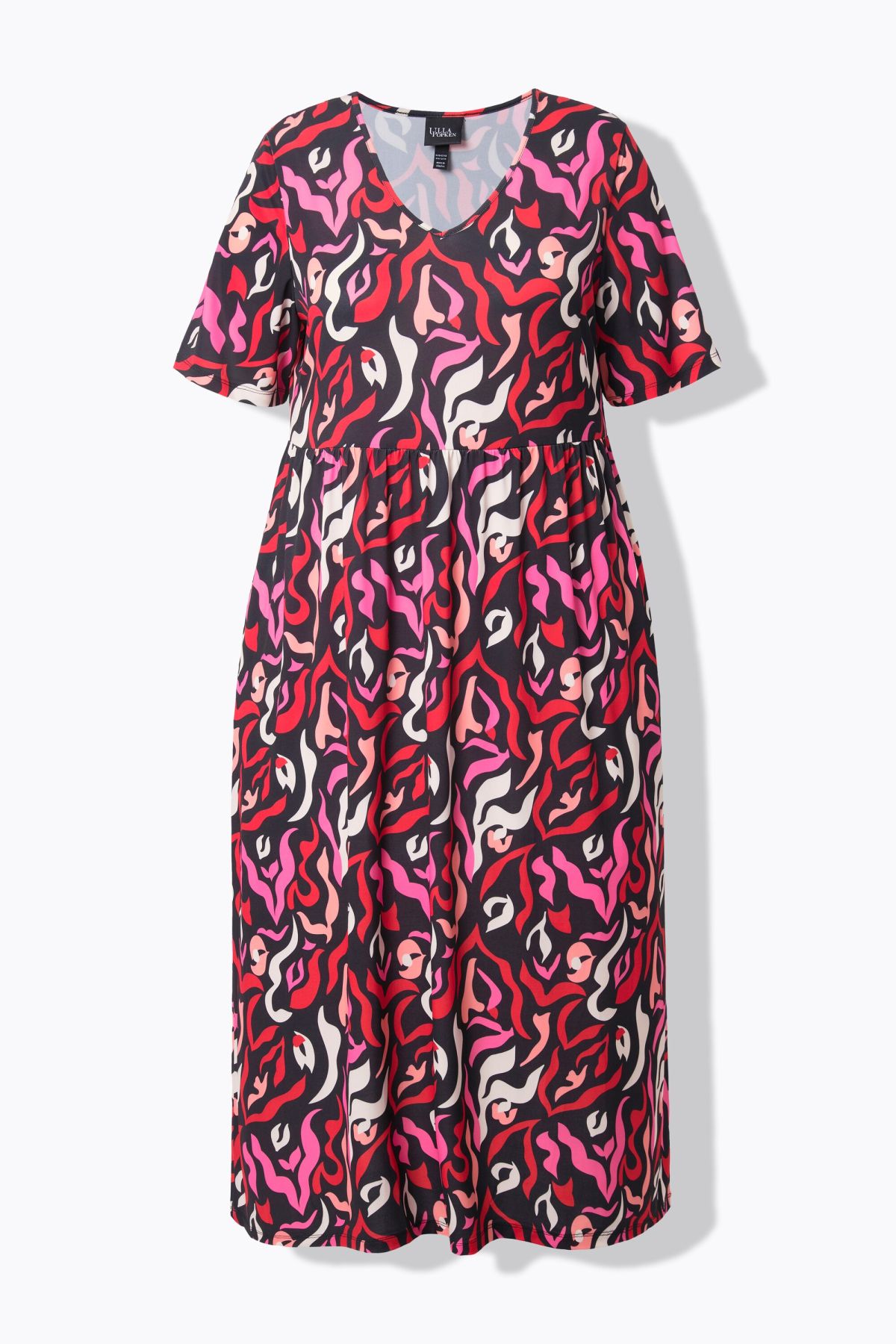 Imprimé tendance, Décolleté en V, Coupe évasée confortable, avec couture horizontale élastique, Poches latérales réservées dans la couture, Jersey au tombé particulièrement fluide, Long. env. 127 cm.