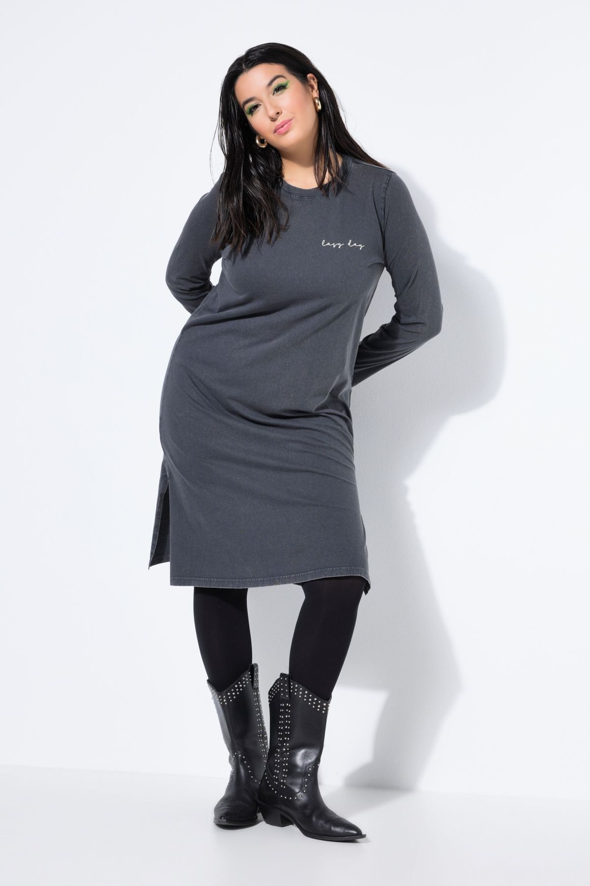 Longueur midi, coupe légèrement évasée, Jersey de coton doux et confortable, Imprimés discrets : petit sur le devant, grand dans le dos, Manches longues, Fentes sur les côtés, Long. env. 110 cm.