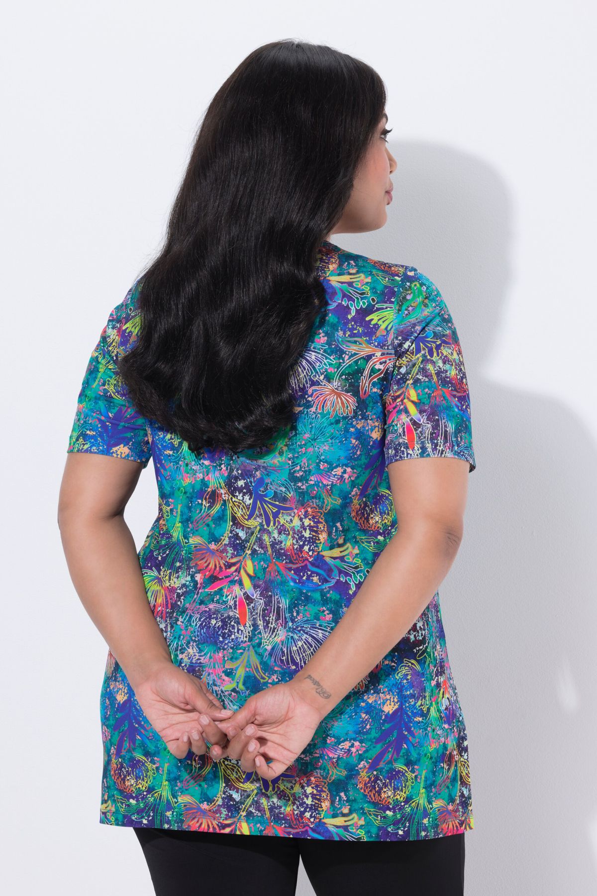 T-shirt long, manches courtes et col en V, coupe évasée
