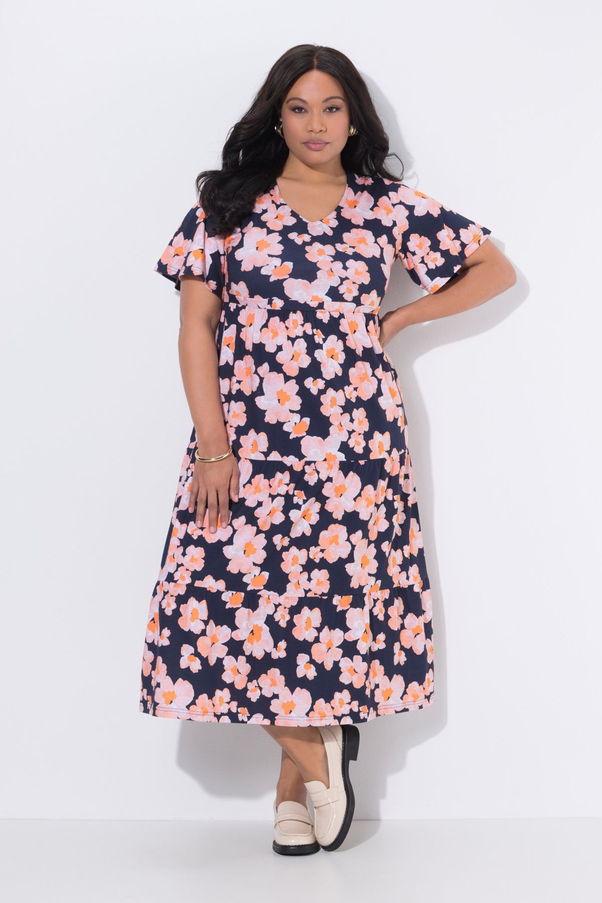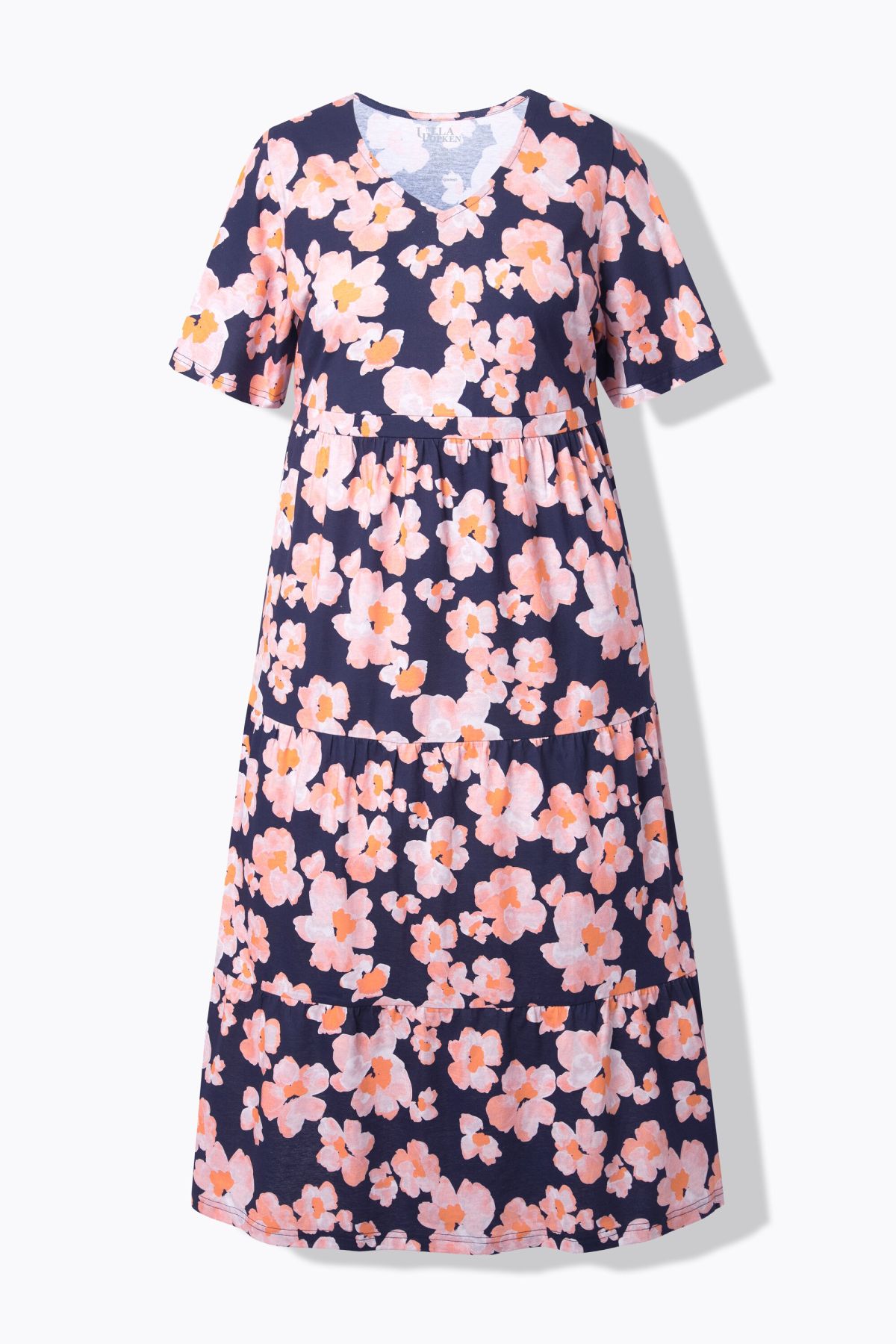 Charmant motif floral, Couture empire élastique et sophistiquée, Jupe longue avec volants féminins, Poches latérales réservées dans la couture, Jersey doux et confortable, en pur coton, Long. env. 127 cm.
