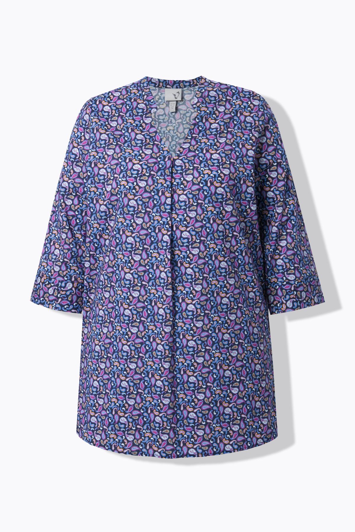 Élégant motif cachemire, Col légèrement montant, décolleté en V et pli fantaisie, Coupe confortable, petite fente de chaque côté, Manches 3/4, Mélange viscose-coton doux et confortable, Long. selon taille env. 80-88 cm.